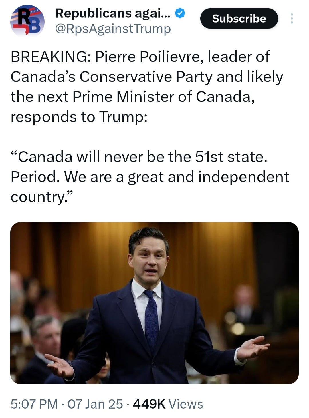 Pierre Poilievre, the leader of the Conservative Party who has been called “the Canadian Donald Trump” and is the person most likely to become the next prime minister, bluntly said “Canada will never be the 51st state. Period. We are a great and independent country.”