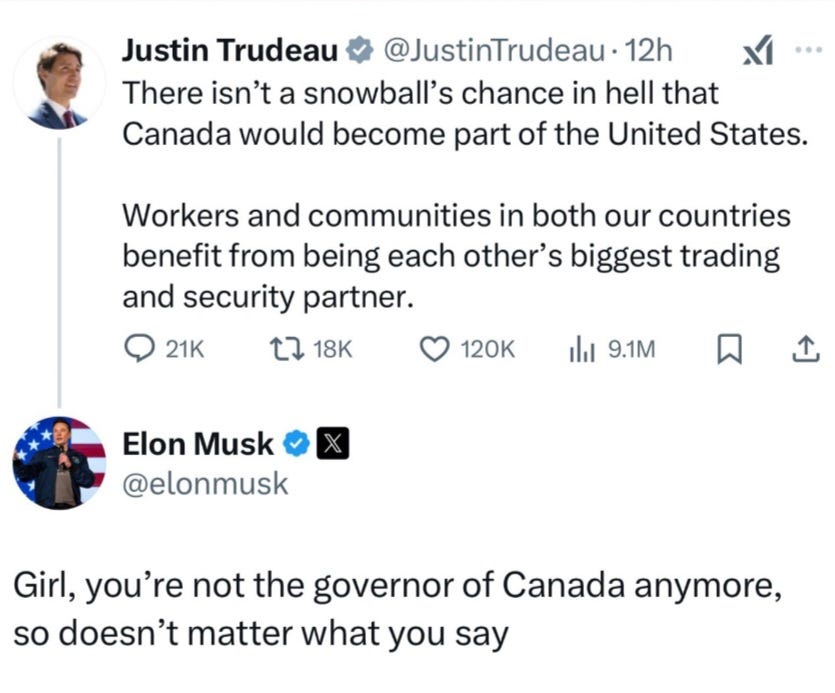 That statement prompted this response from Elon Musk, the owner of Twitter/X who is currently hanging around Trump as often as possible: “Girl, you're not the governor of Canada anymore, so doesn't matter what you say.”