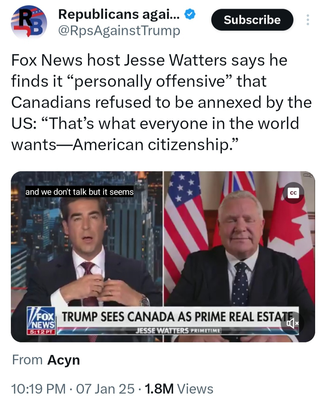 Even Fox News is getting into the act with one of its on-air hosts, Jesse Watters saying that he finds it “personally offensive” that Canadians refused to be annexed by the US while adding “That's what everyone wants in the world—American citizenship.”