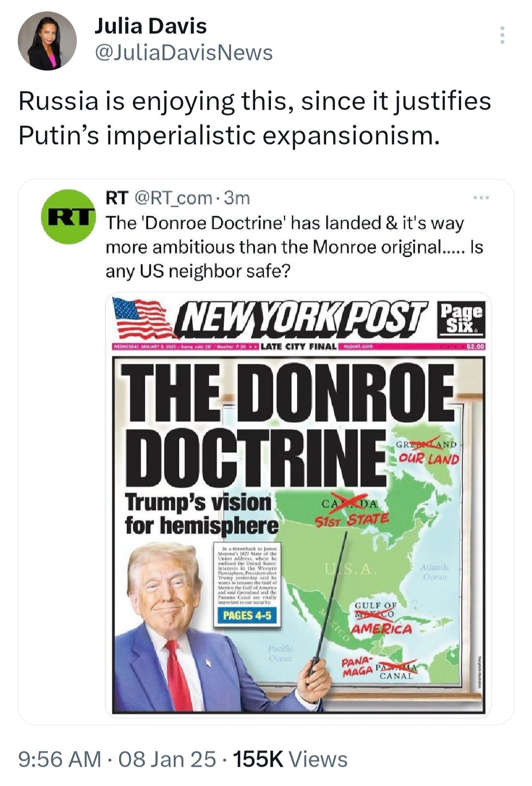 Theory 5: Russia has somehow encouraged Donald Trump to say these things as a way of sowing chaos among US allies while also justifying Russia's imperialistic expansionism, as explained in this tweet by Julia Davis while retweeing this tweet by Russian state media RT that included a graphic of a cover of The New York Post with the headline “The Donroe Doctrine” and RT’s own message that said “The ‘Donroe Doctrine’ has landed & it's way more ambitious than the Monroe original…..Is any US neighbor safe?”