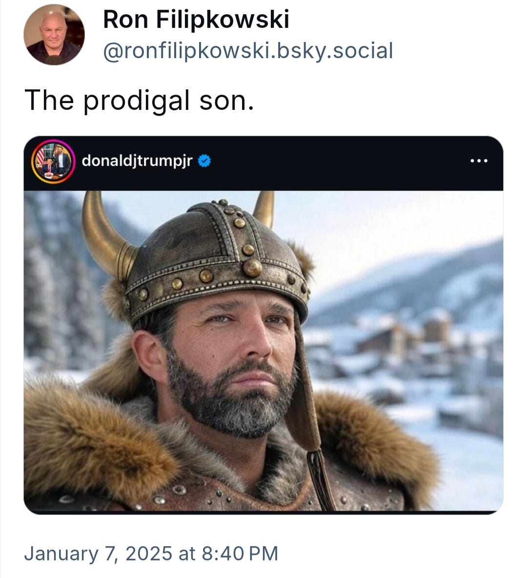 Trump's son, Donald Trump Jr., flew into Greenland for a day but he didn’t meet with any officials although he shot video footage for future episodes of his podcast. The trip apparently inspired Don Jr. to post what looks like an AI generated photo of himself as a viking.