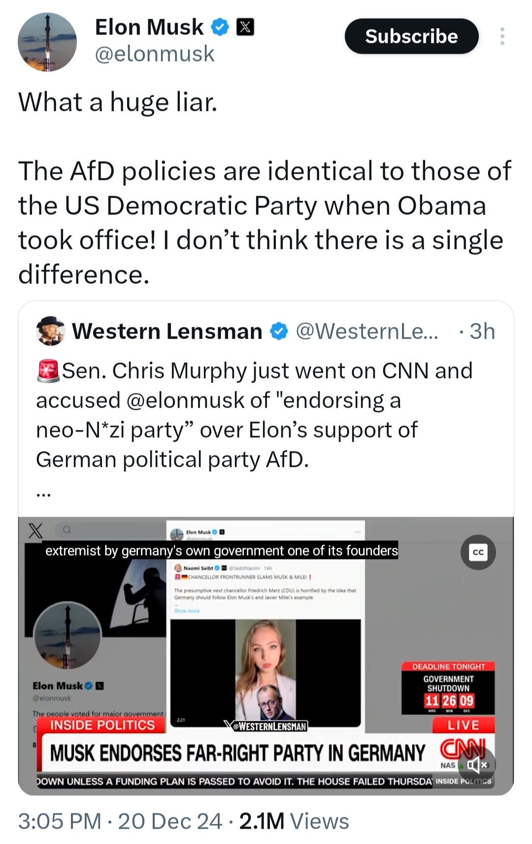 When Senator Chris Murphy went on CNN and denounced Musk's support of AfD by accusing him of endorsing a neo-Nazi party, Musk made this tweet calling Senator Murphy “a huge liar” and claiming that the AfD policies are identical to those of the US Democrat Party when Barack Obama took office. He doesn't think that there is a single difference between the two.