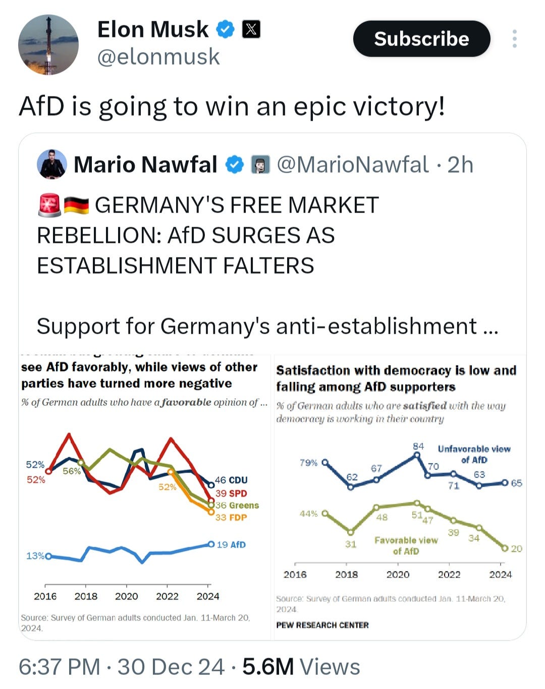 And one more thing: It doesn't seem to be a coincidence that the Vladimir Putin-supporting Elon Musk strongly favors both the Vladimir Putin-supporting Nigel Farage and the pro-Kremlin Alliance Für Deutschland.