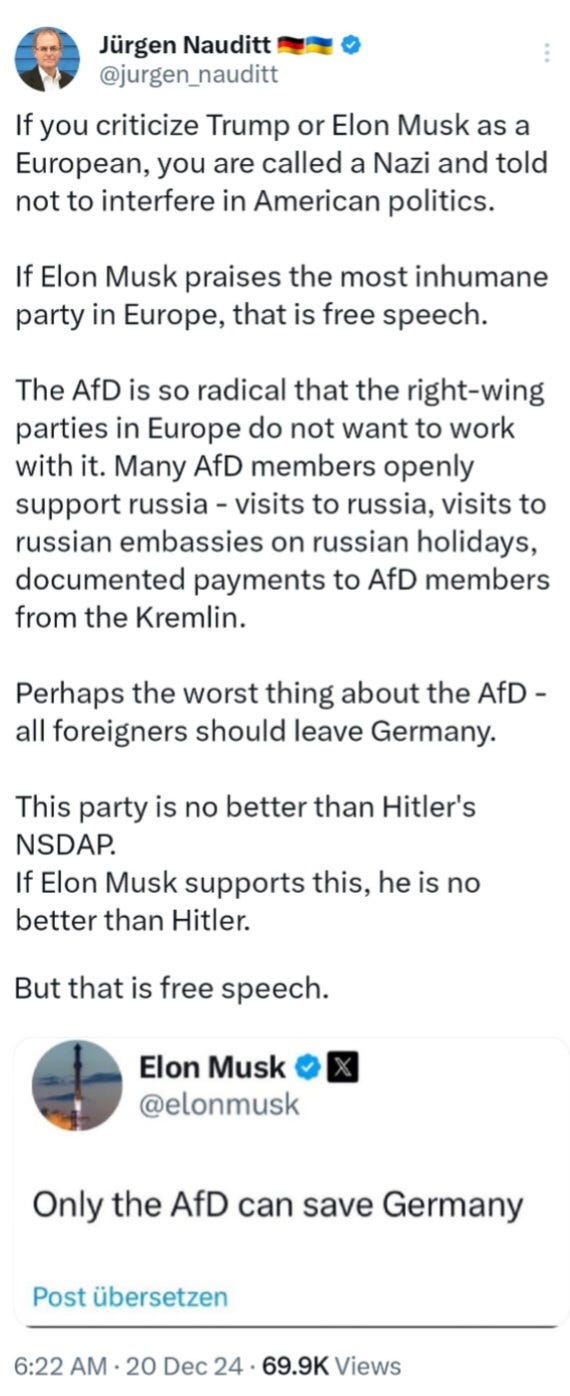 Not everyone in Germany is enamored with Elon Musk praising AfD. As Jürgen Nauditt wrote on Twitter/X: