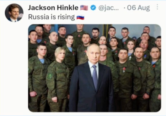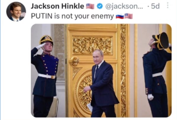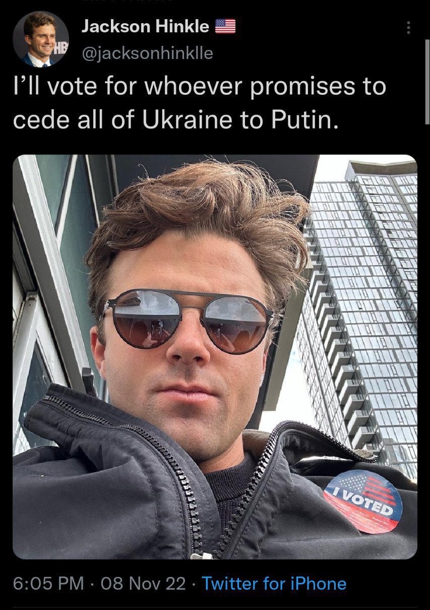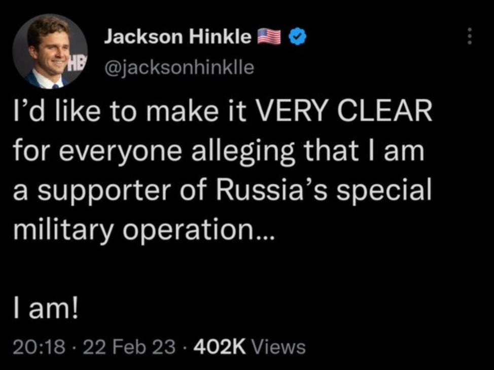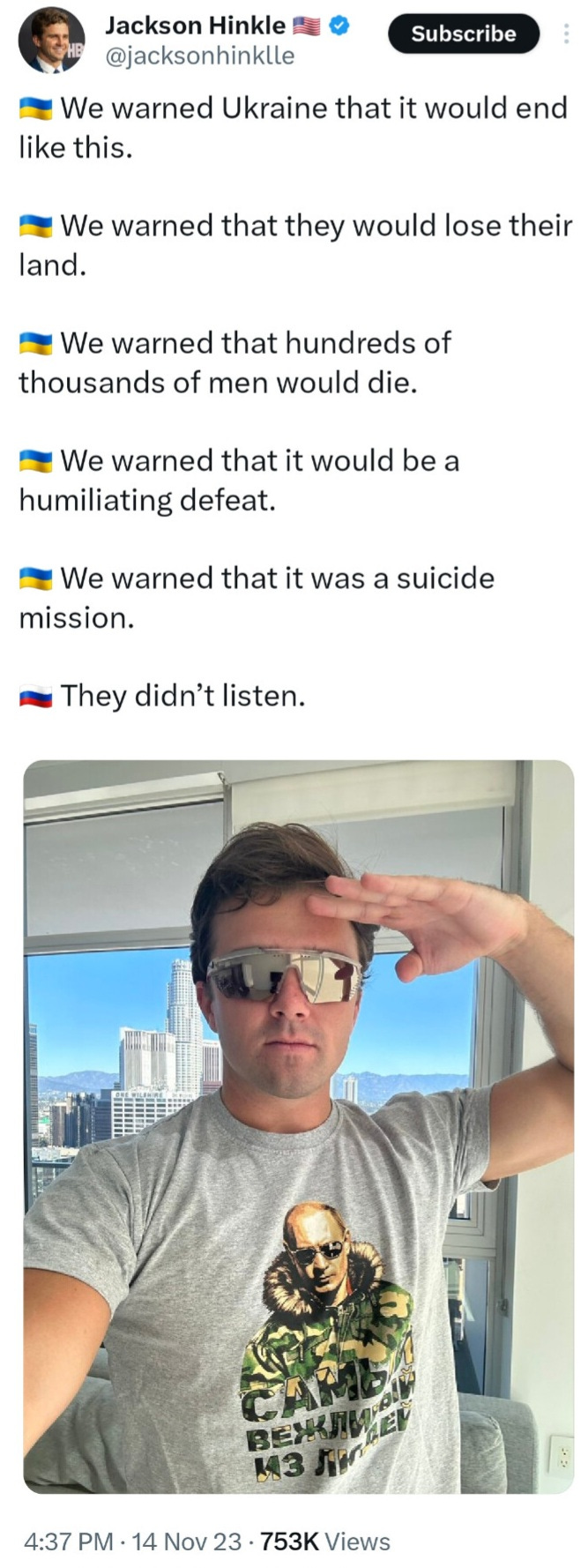 The only silver lining is that Jackson Hinkle has ruined his own future. The current wars will eventually end and Putin will die. (After all, he is 71 years old as of this writing.) This situation will fade into the past. The only question is when it will happen. But there will be a day when it does happen. By the time it happens, Hinkle will still be a relatively young man somewhere between the ages of 25-40. He will have to find a new line of work, especially if Russia becomes a fully democratic country that has renounced Putin and his ilk just like how Germany had officially renounced Adolf Hitler and his Nazis.