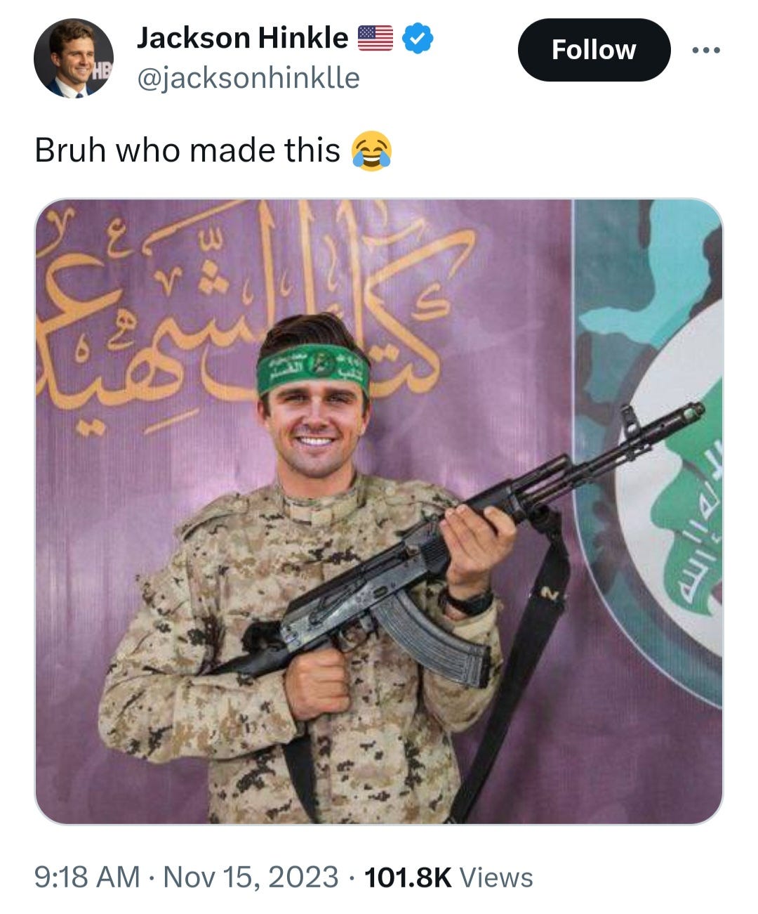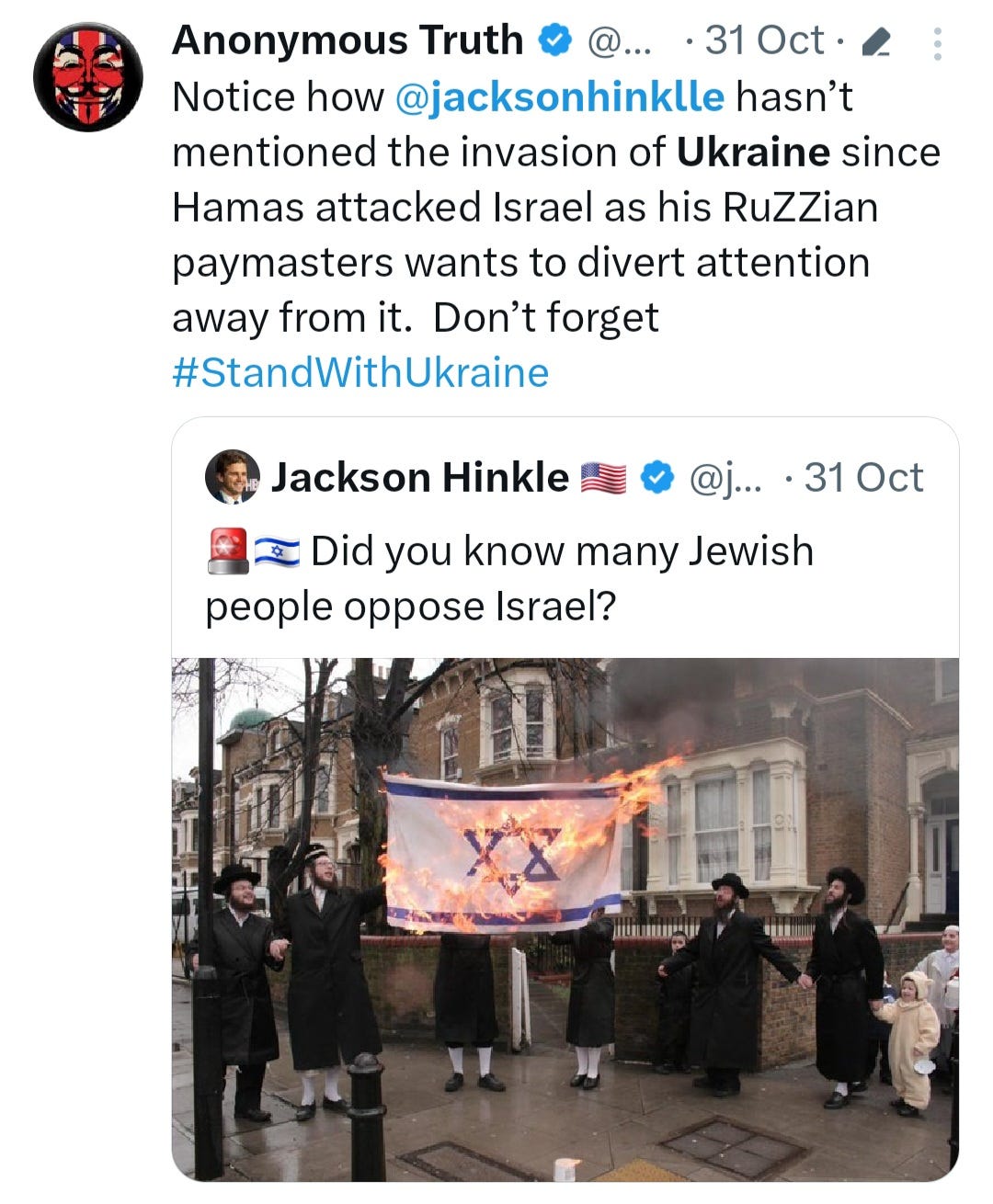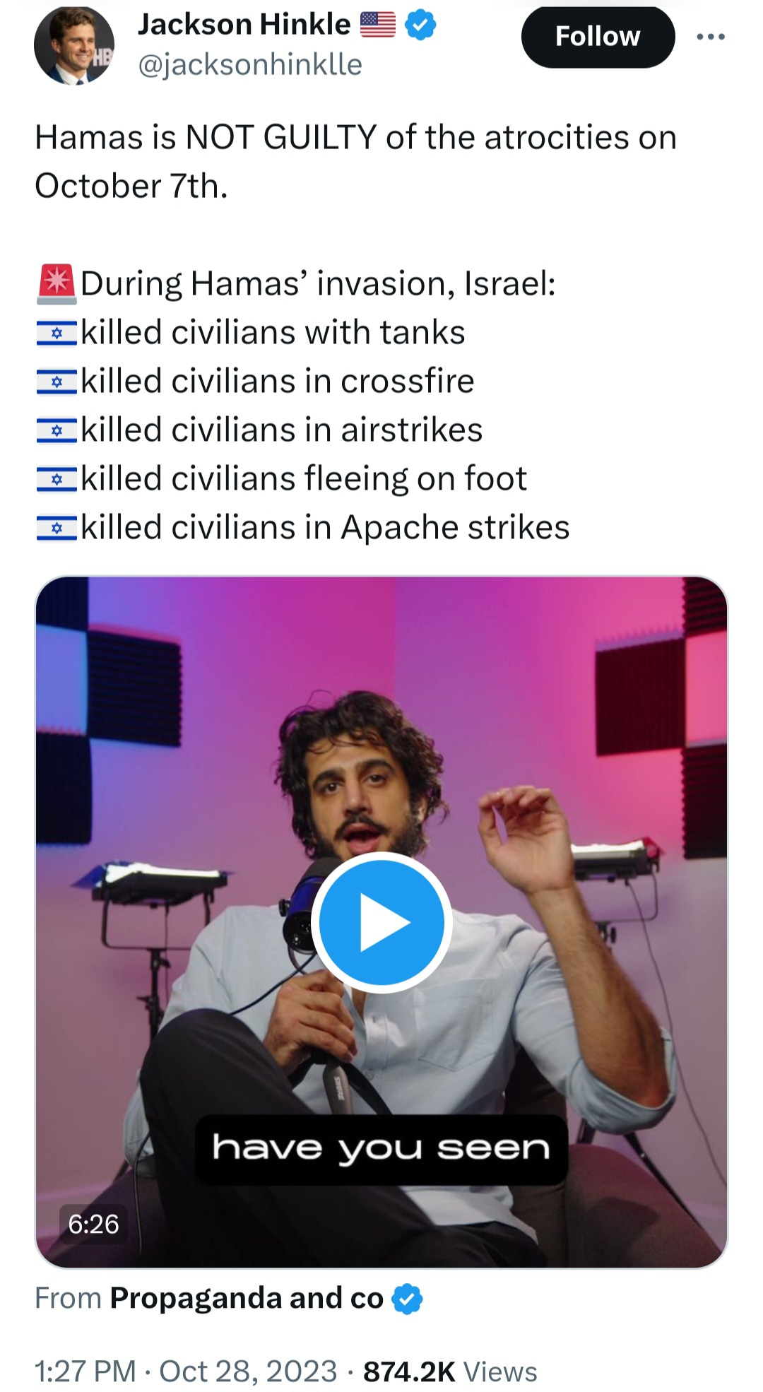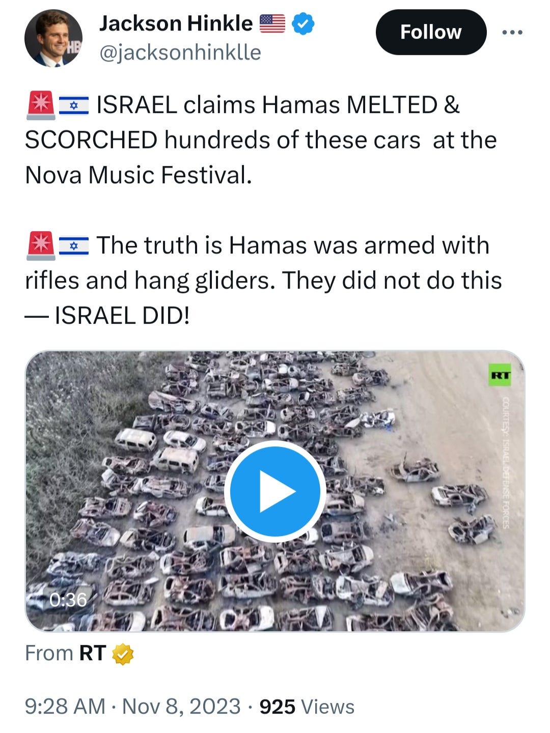 Soon after his return Hamas launched its huge October 7 terrorist attack on Israel. Since then Jackson Hinkle has been tweeting nonstop about the Middle East. Since Russia is aligned with Iran, who finances Hamas, it’s not a big shock to see Jackson Hinkle making anti-Israel/pro-Hamas tweets like these.
