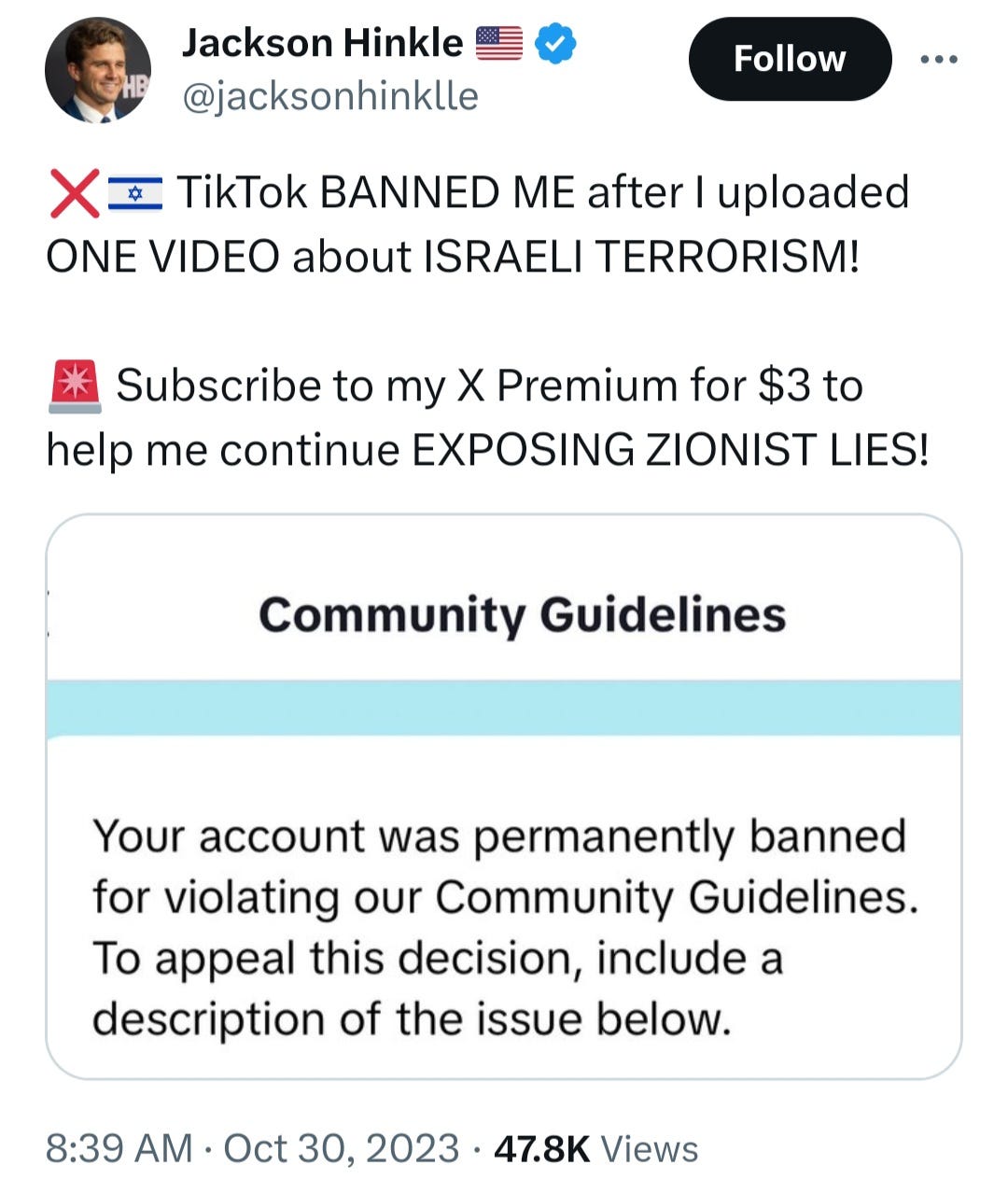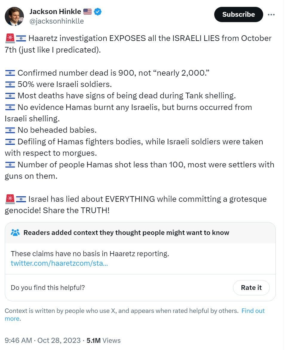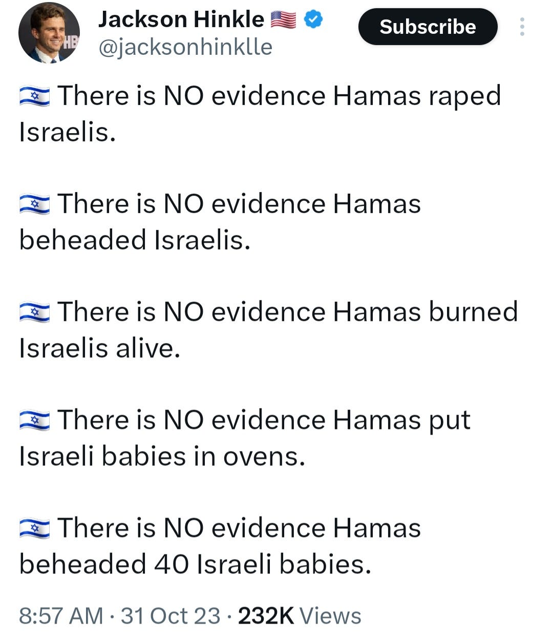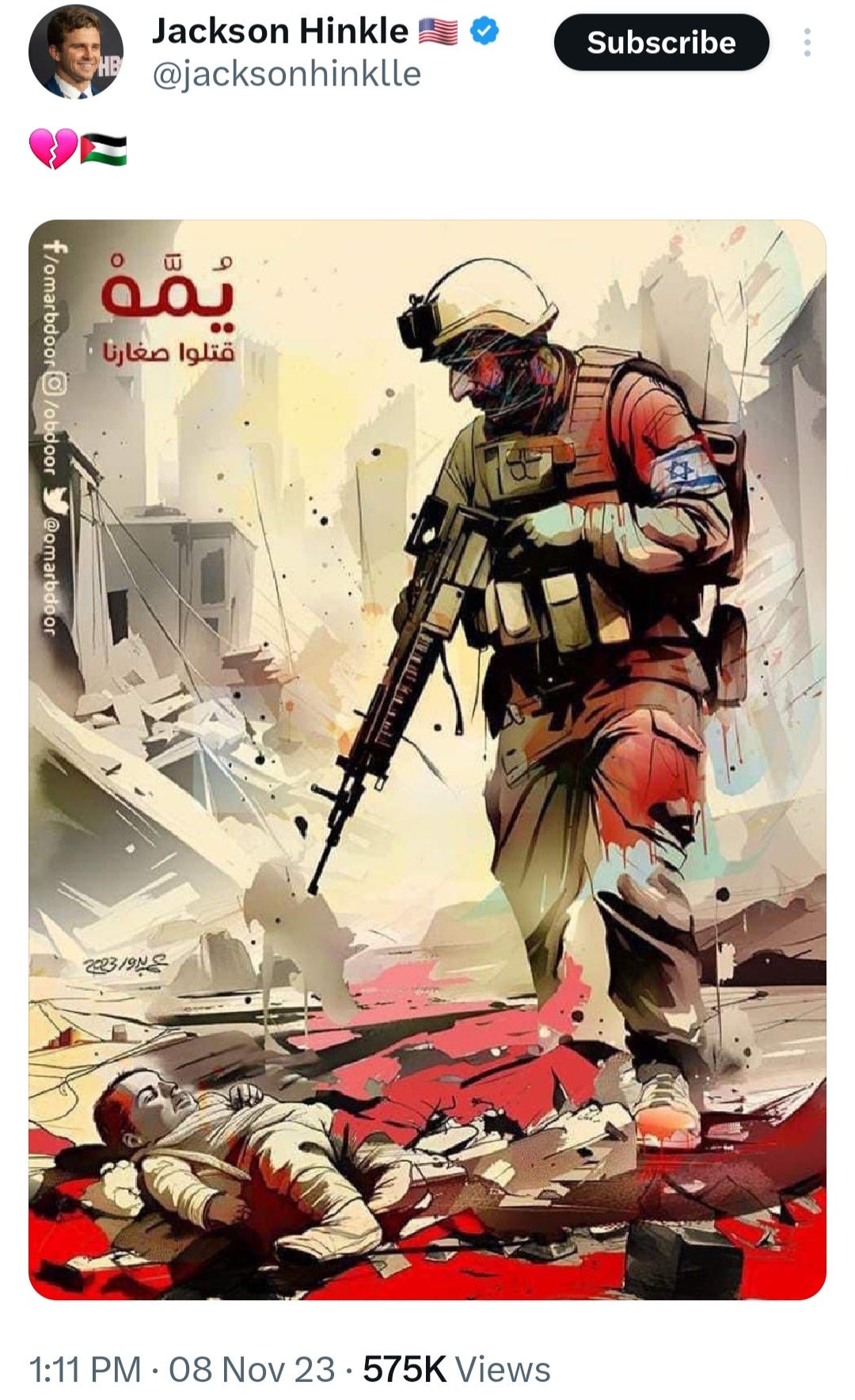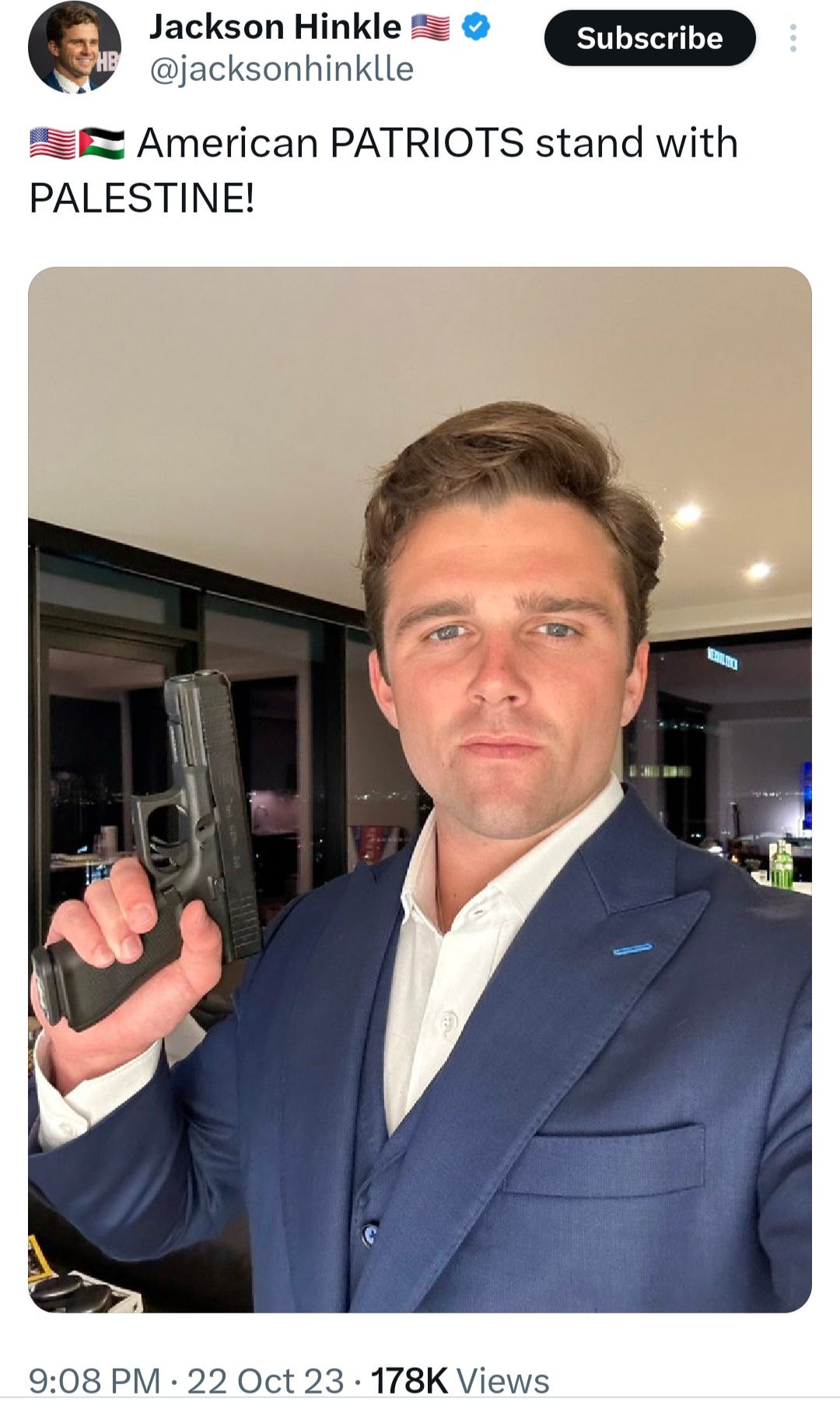 Soon after his return Hamas launched its huge October 7 terrorist attack on Israel. Since then Jackson Hinkle has been tweeting nonstop about the Middle East. Since Russia is aligned with Iran, who finances Hamas, it’s not a big shock to see Jackson Hinkle making anti-Israel/pro-Hamas tweets like these.