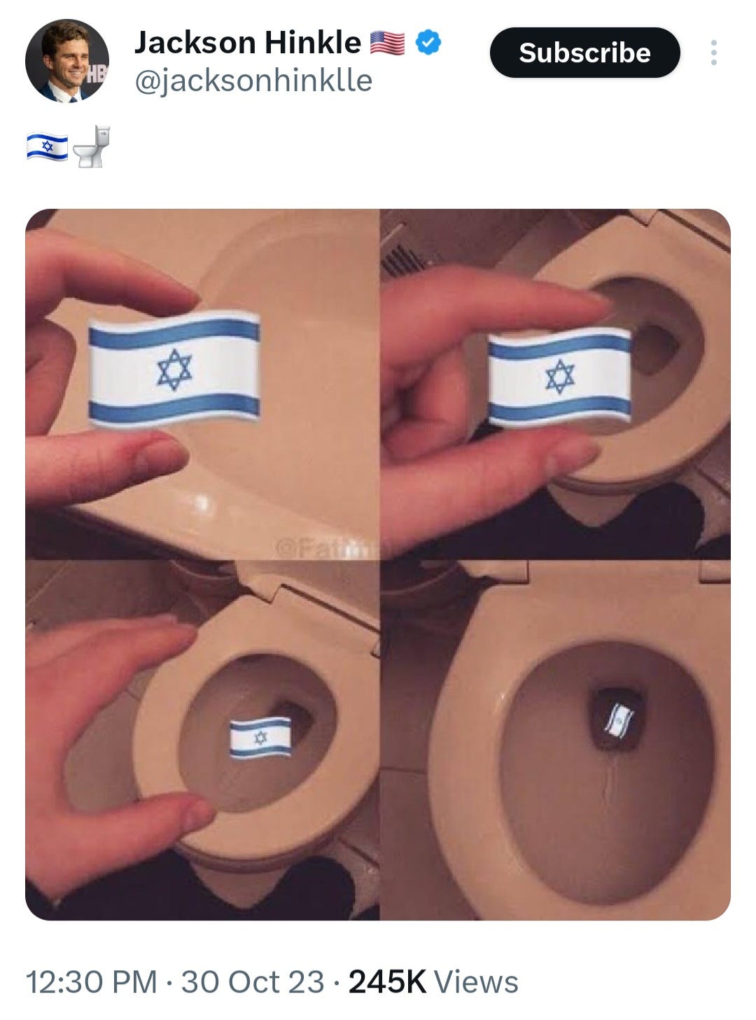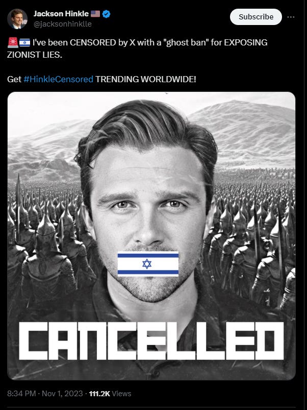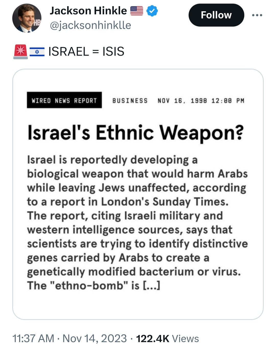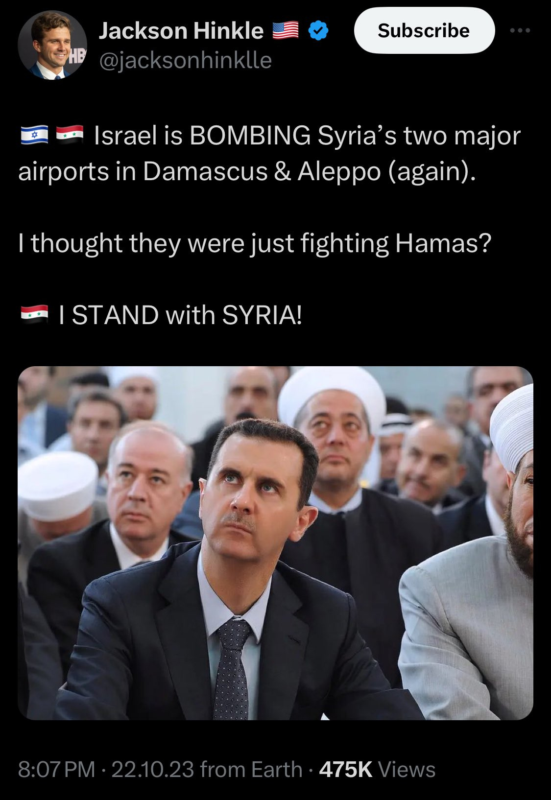 Soon after his return Hamas launched its huge October 7 terrorist attack on Israel. Since then Jackson Hinkle has been tweeting nonstop about the Middle East. Since Russia is aligned with Iran, who finances Hamas, it’s not a big shock to see Jackson Hinkle making anti-Israel/pro-Hamas tweets like these.