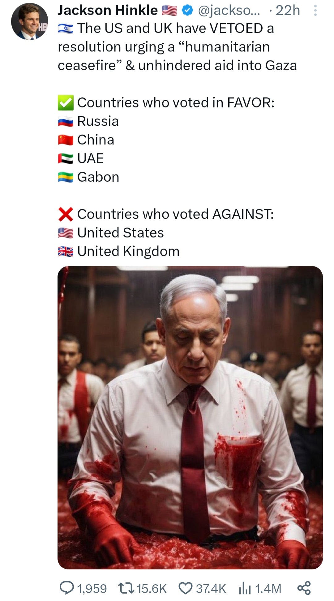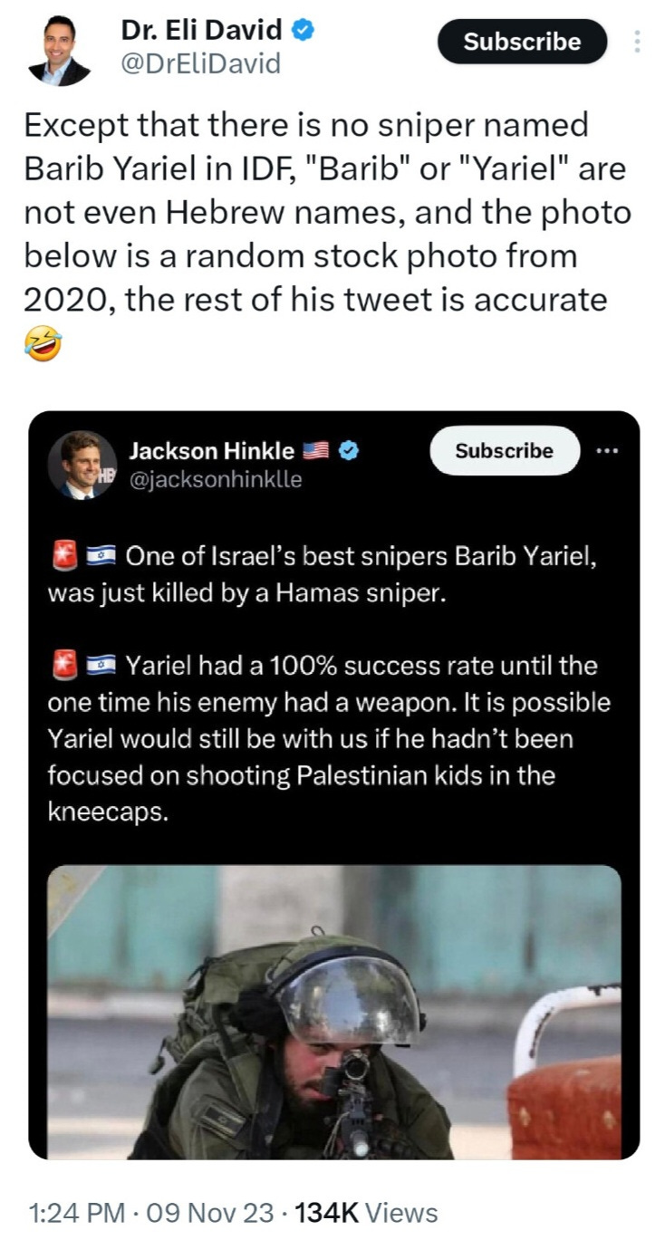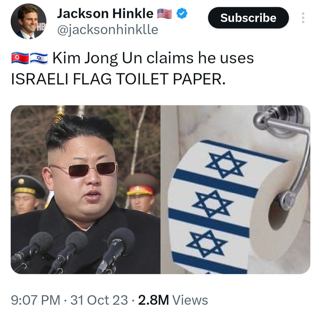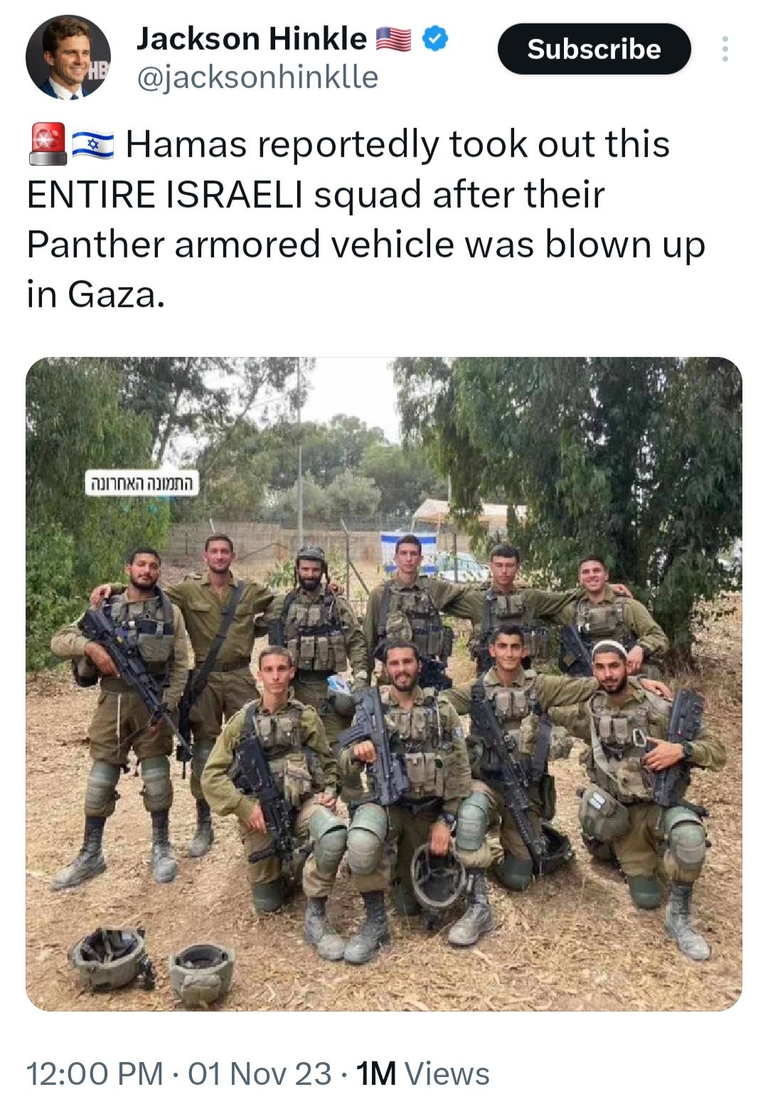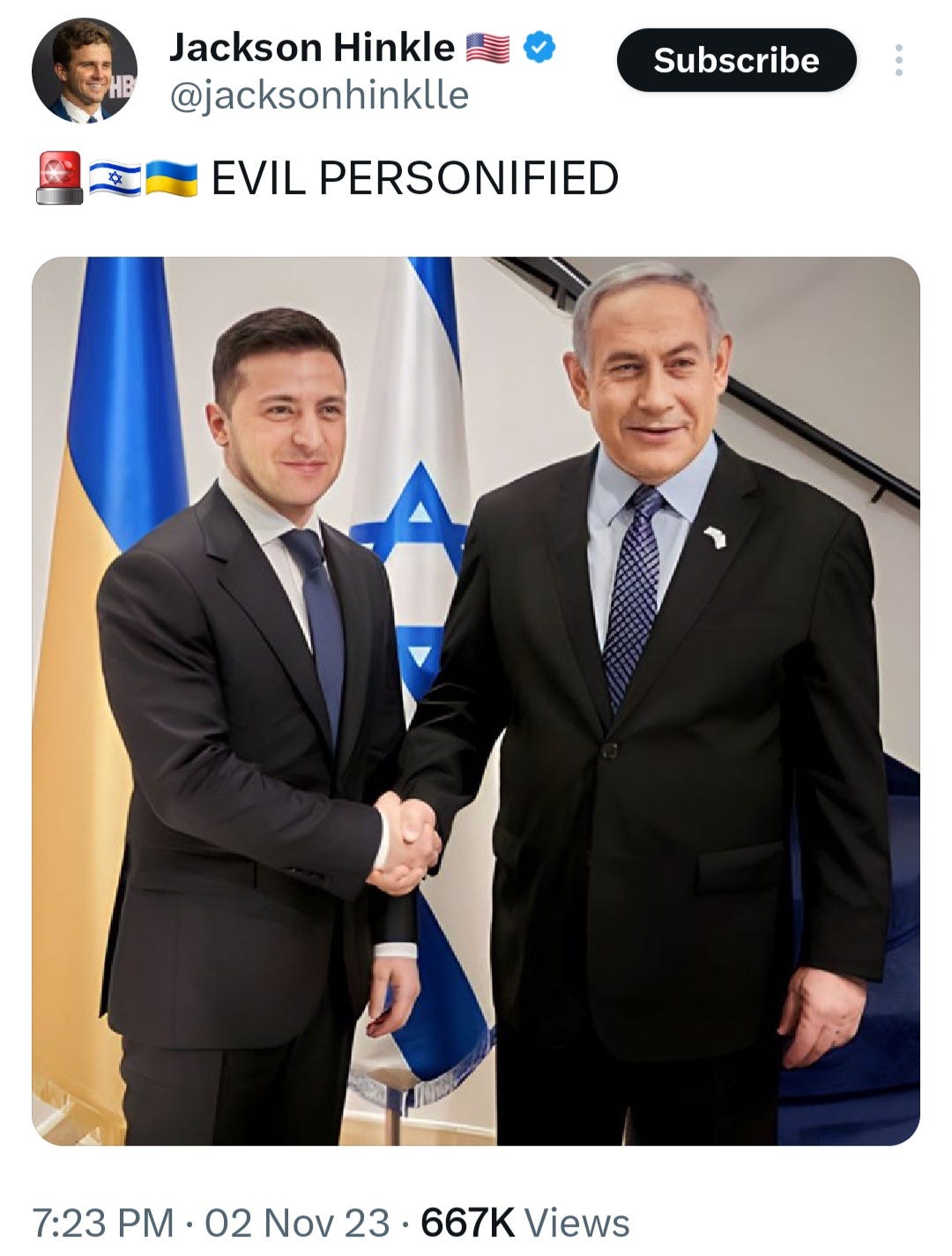 Soon after his return Hamas launched its huge October 7 terrorist attack on Israel. Since then Jackson Hinkle has been tweeting nonstop about the Middle East. Since Russia is aligned with Iran, who finances Hamas, it’s not a big shock to see Jackson Hinkle making anti-Israel/pro-Hamas tweets like these.