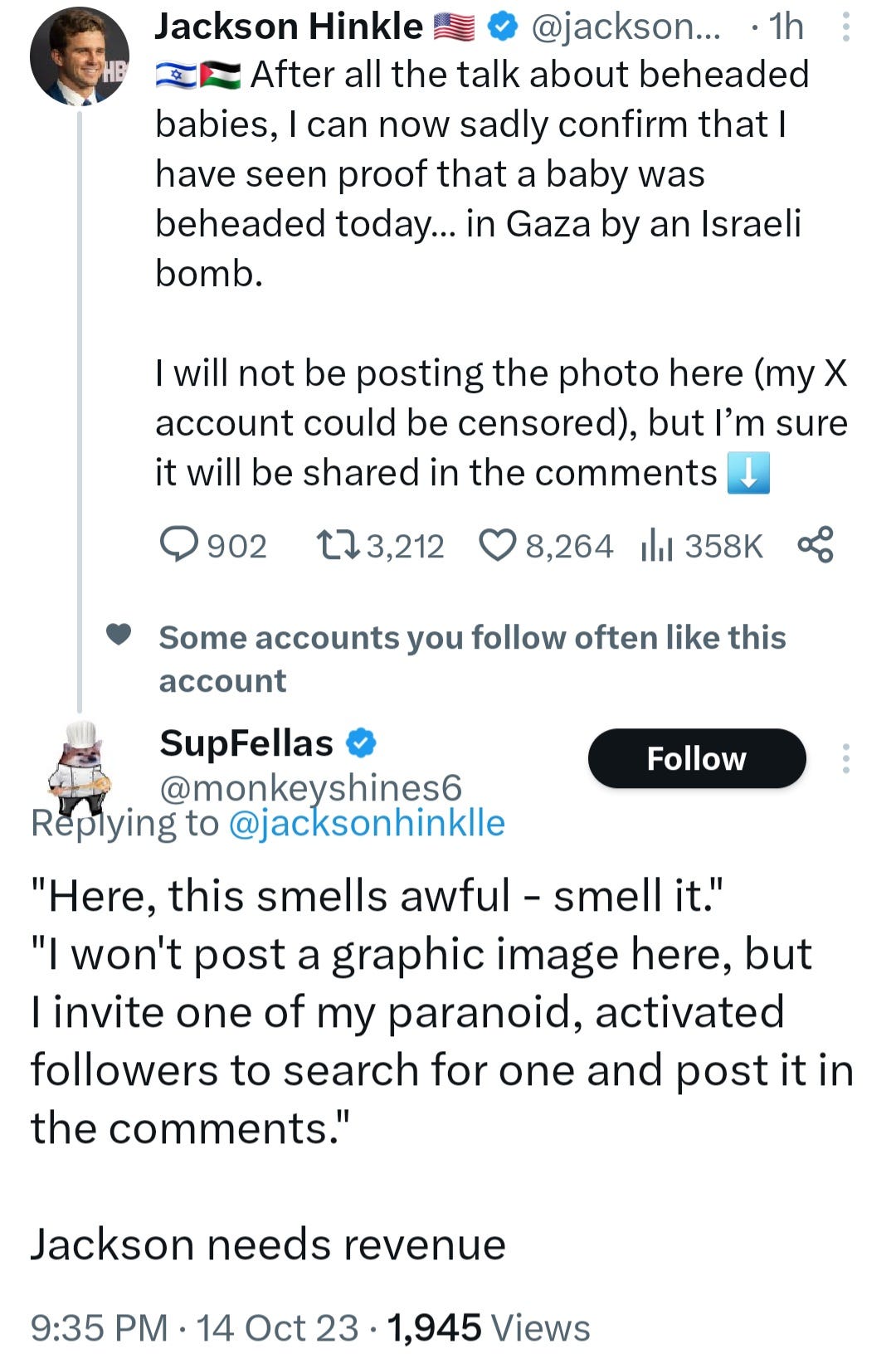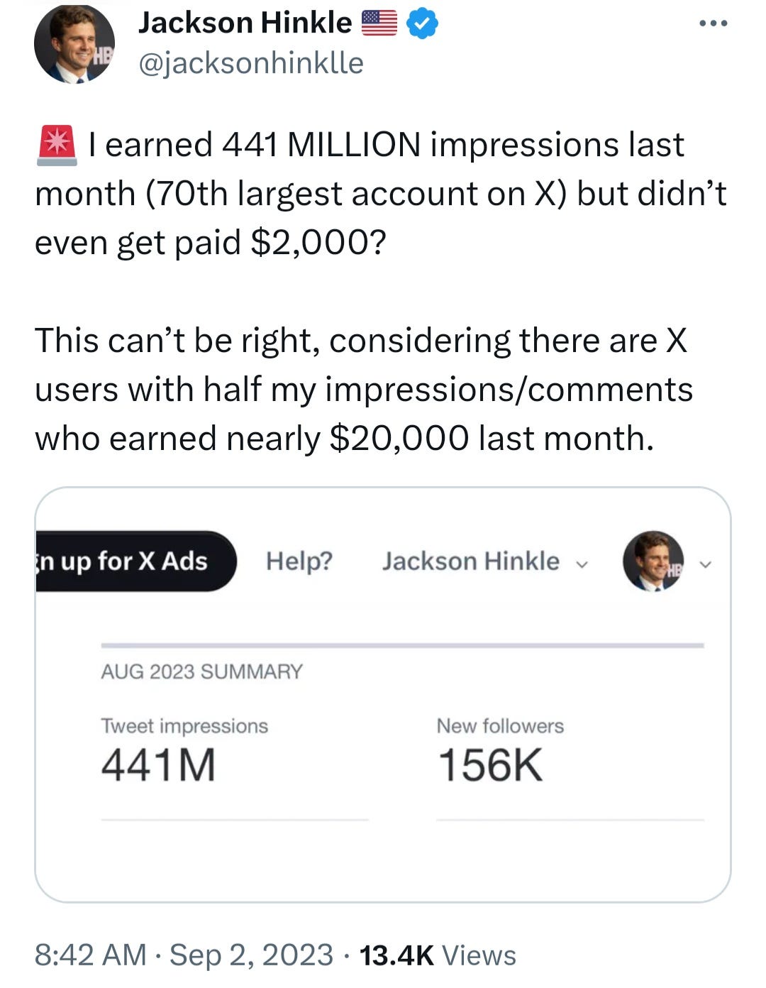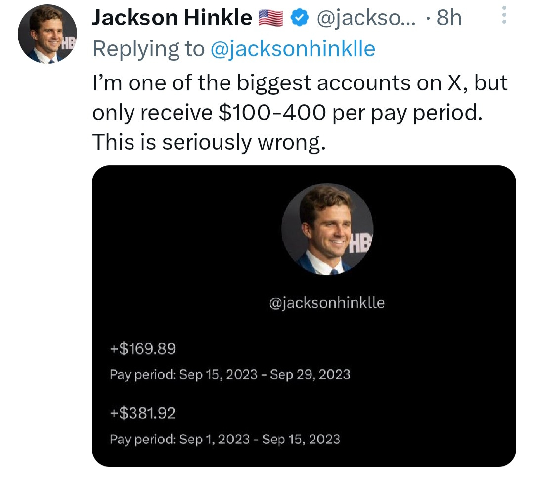 When Elon Musk took over Twitter last year then renamed it X, he started a creators program where those who pay $8 per month to take part in that program can take part in the advertiser revenue profits based on the amount of attention that a certain post gets. It’s obvious that Jackson Hinkle is being provocative online in the hopes that people will fight with him online or share his tweets to others, which will result in more attention, and he could get ad revenue.