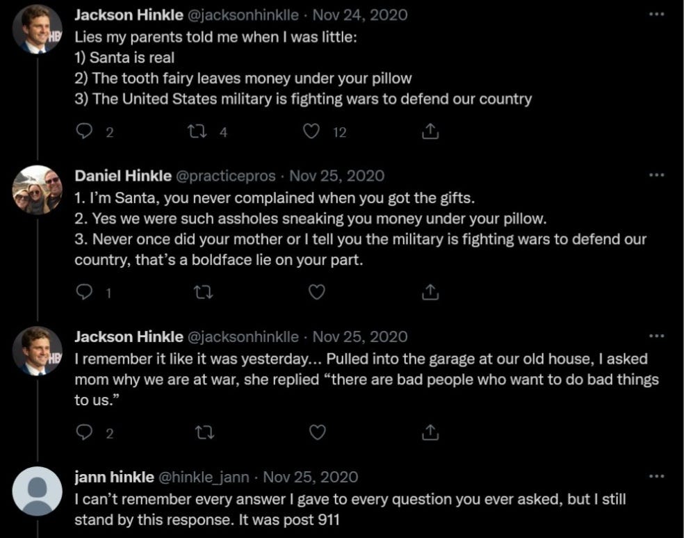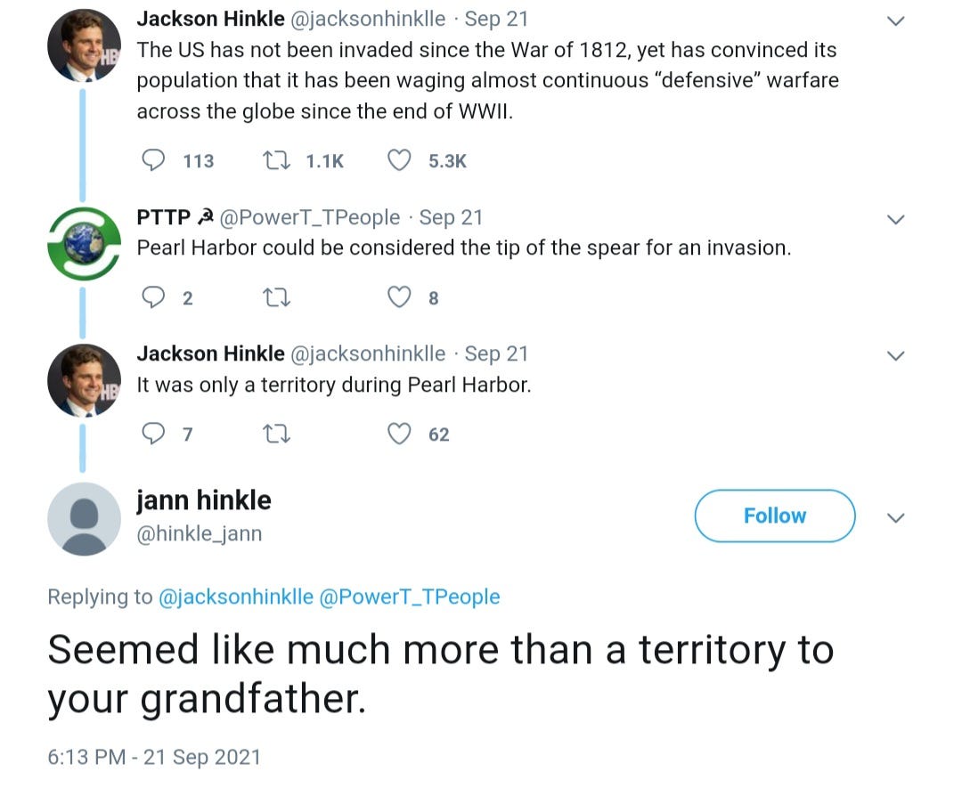 A few months later Jackson Hinkle made another tweet about how the US hadn’t been invaded since the War of 1812. Someone mentioned the 1941 Japanese attack on Pearl Harbor. Hinkle’s response that Pearl Harbor was just a territory during World War II led to a response from his mother saying that Pearl Harbor seemed to be much more than a territory to his grandfather at the time.