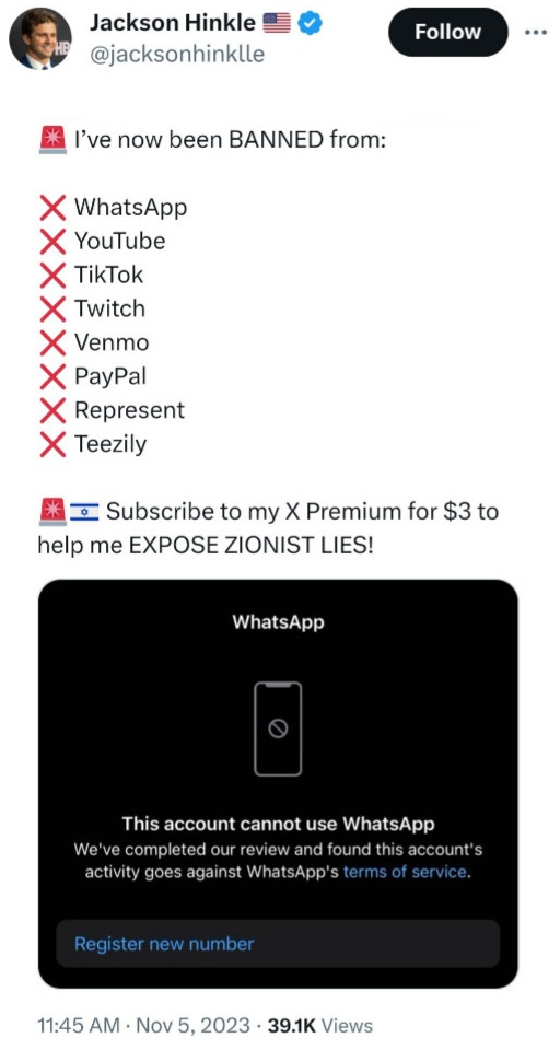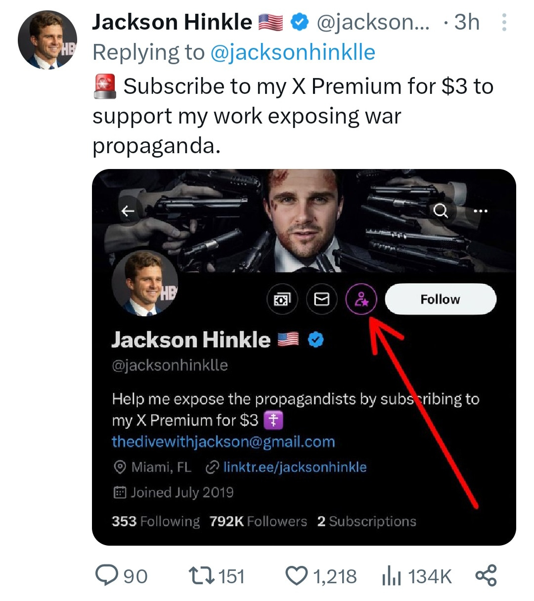 In many ways, Twitter/X is Jackson Hinkle’s last chance to make a living at being an online Kremlin propagandist since he’s been banned from many other platforms. But his efforts to make money from Twitter/X doesn’t always go smoothly for him.