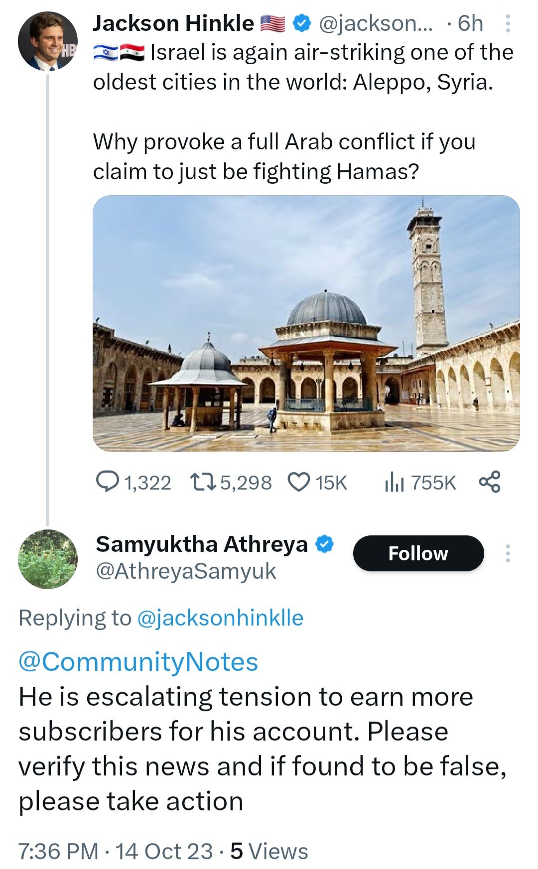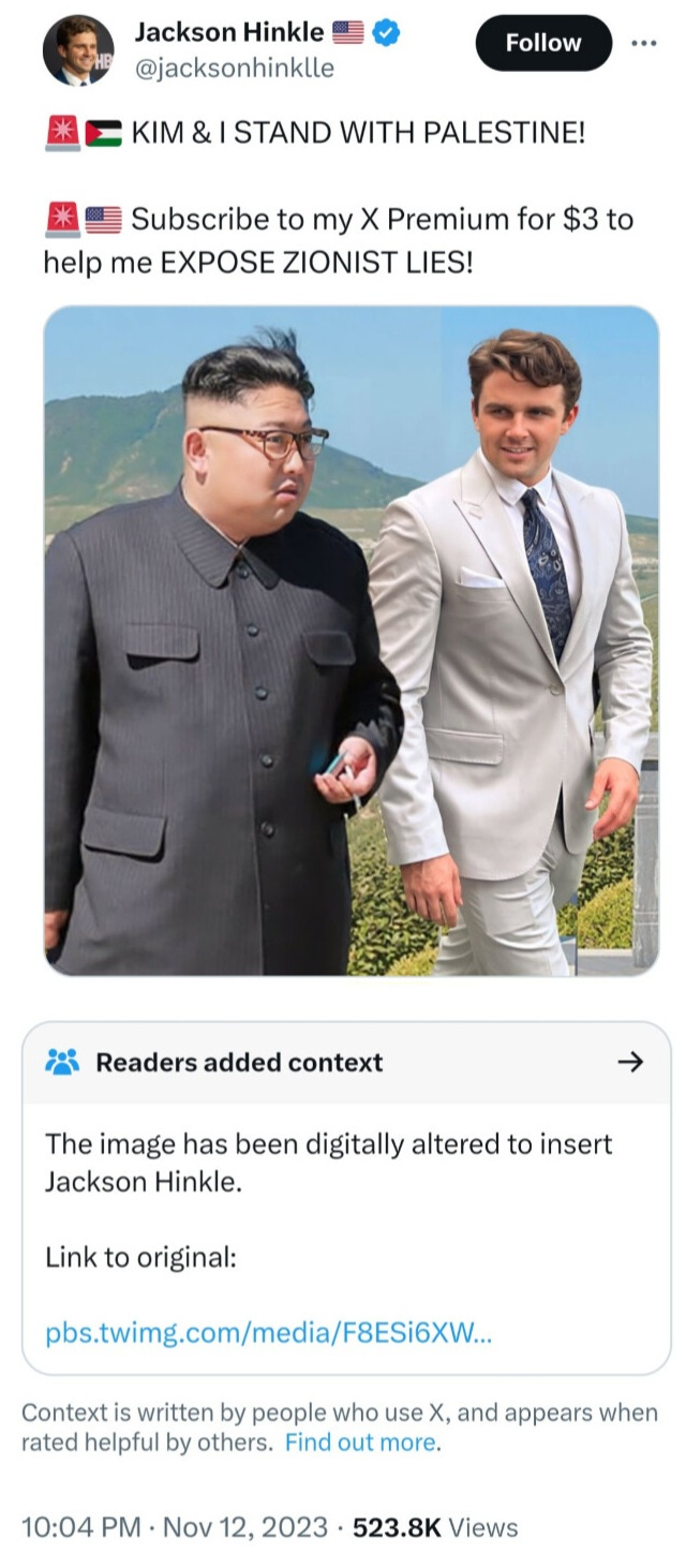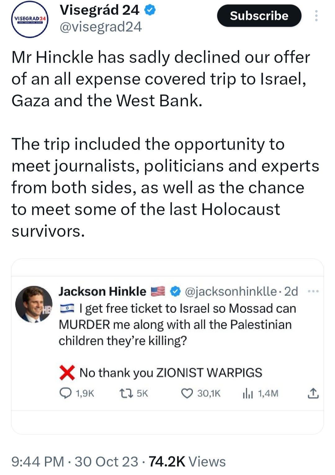 And all those tweets are just tips of the iceberg. There are literally hundreds of tweets that Jackson Hinkle has posted since the Hamas terrorist attacks. Just because Jackson Hinkle calls himself a “journalist” who claims to be posting the “truth” about Israel and Palestine that “the mainstream media doesn’t want anyone to know about” doesn’t mean that he is actually posting factual stuff about that war. Here’s a story debunking a video that Hinkle has posted claiming that it came from the current war. The Guardian has named Hinkle as being one of the biggest disseminators of false information about the current Israel-Hamas Conflict. At one point Visegrád 24 had offered Jackson Hinkle a free all-expenses paid trip to Israel, Gaza, and the West Bank. It would’ve been a golden opportunity for Hinkle to learn about the complexities of Israeli-Palestinian politics. But Hinkle turned down that offer. (Whether he turned it down of his own volition or if someone in the Kremlin told him to turn it down is unknown.)