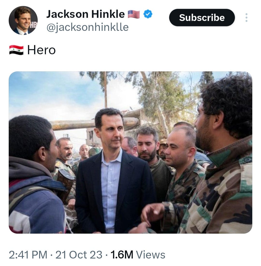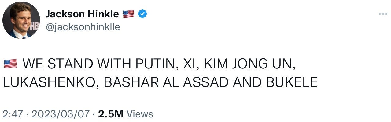 He has also expressed admiration for other world leaders as well, such as Kim Jong Un, Bashar al-Assad, and Xi Jingping. The thing they have in common is that they are all authoritarian dictators. In fact, there never seems to be an authoritarian dictator that Jackson Hinkle has never liked.