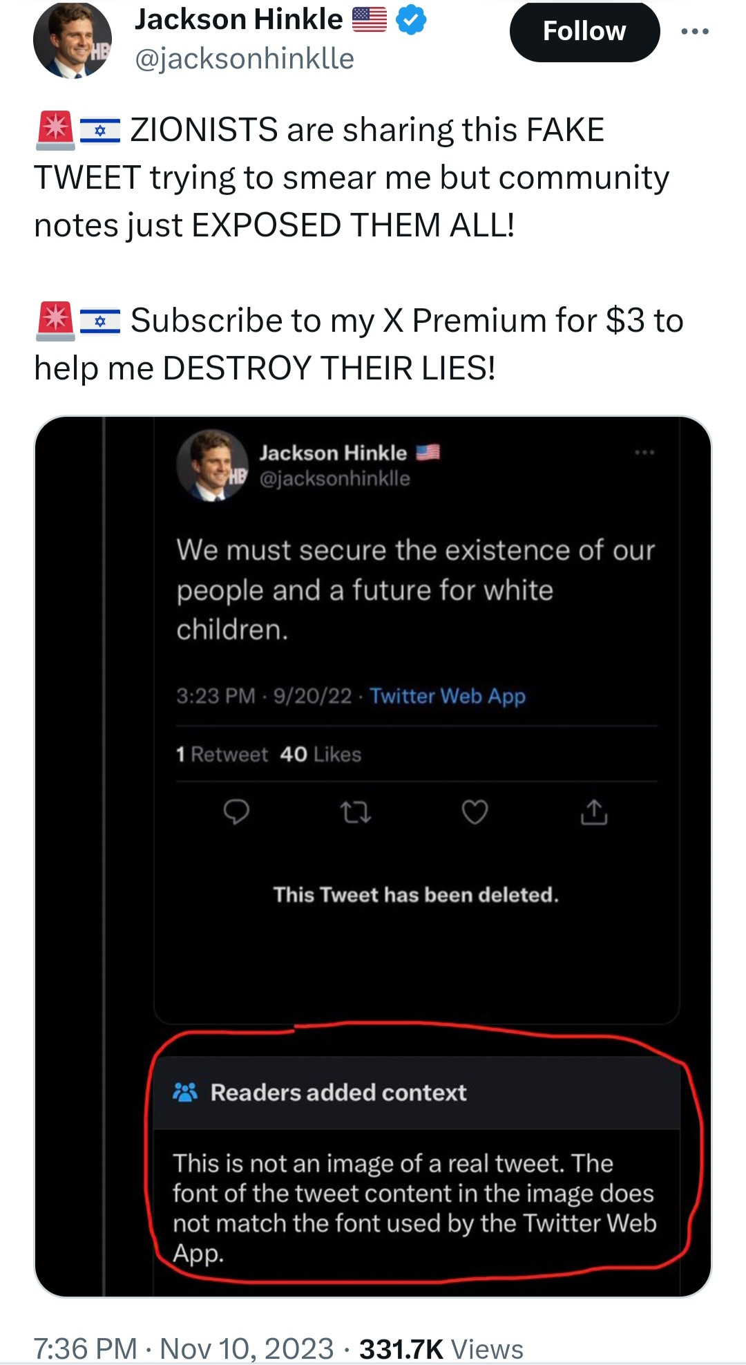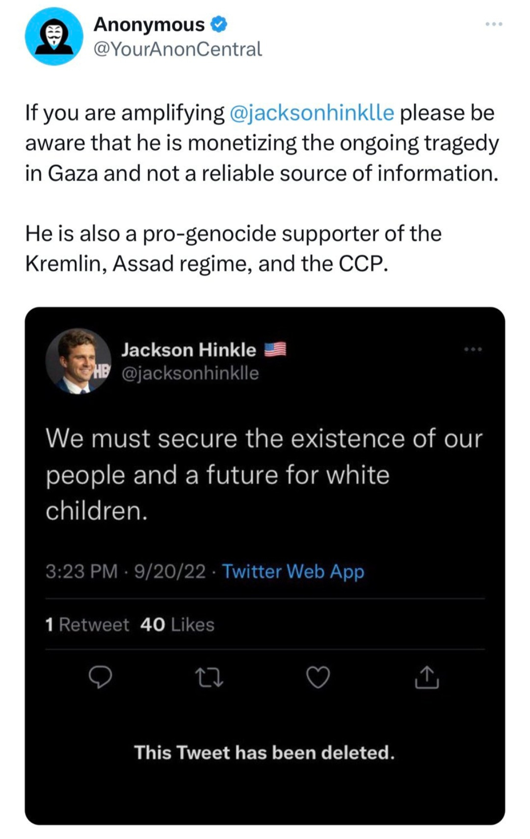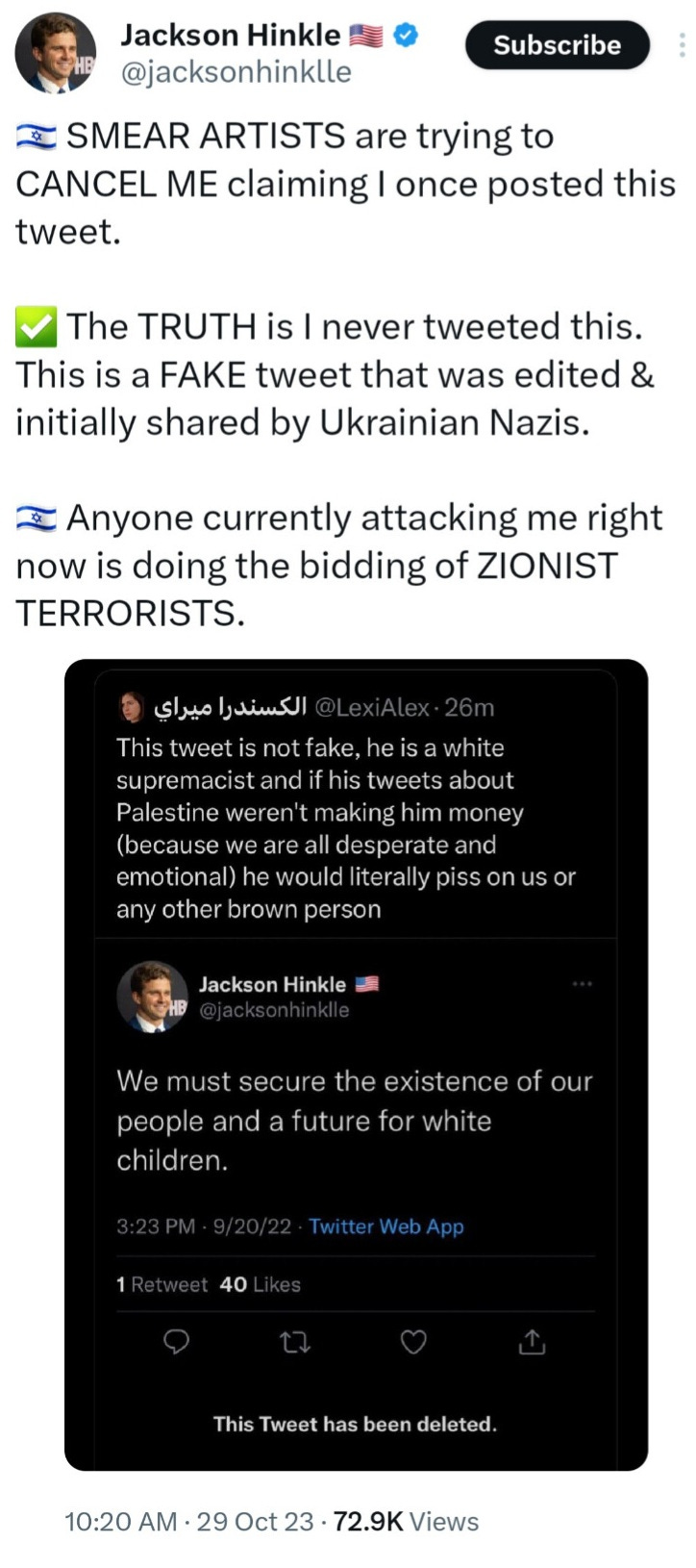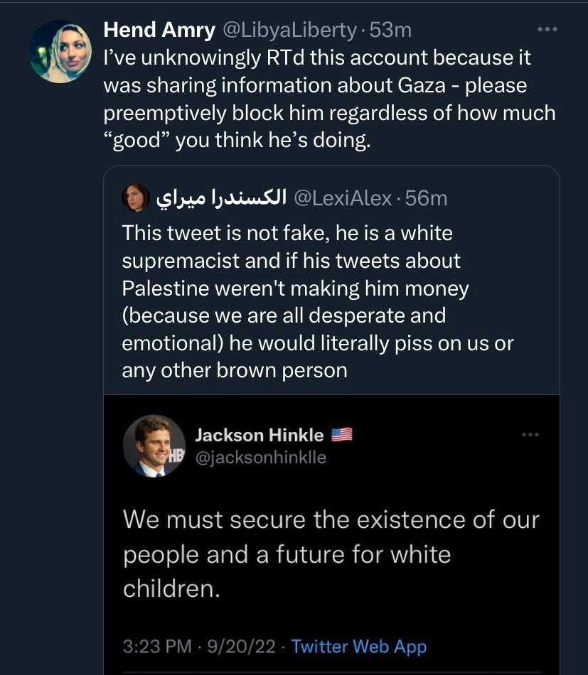 The last few tweets included a screenshot of a Jackson Hinkle tweet where he seems to be a white supremacist. To be fair, Hinkle has denied ever making that tweet.