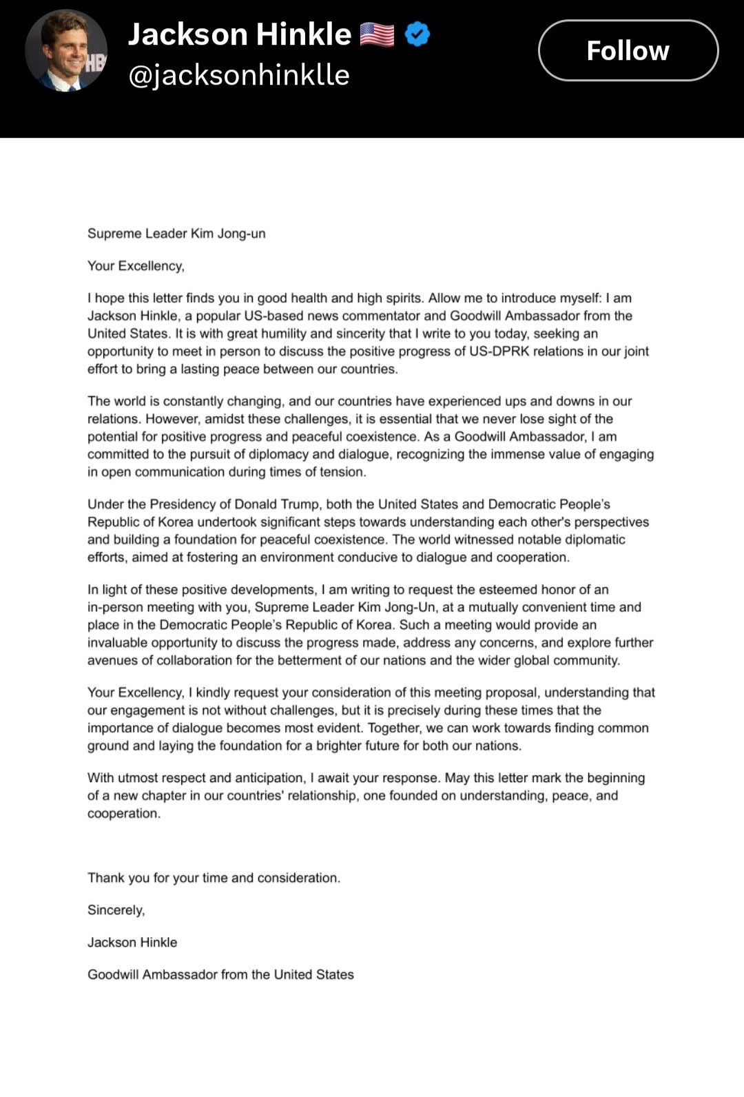 The most hilarious example of Hinkle simping for authoritarian leaders is when he wrote this letter to North Korean leader Kim Jong Un where he introduced himself as a “Goodwill Ambassador from the United States” and he offered to come to North Korea for a visit. (It’s obvious that Jackson Hinkle doesn’t know anything about what previously happened to another young American visitor to North Korea named Otto Warmbier just a few years earlier.)
