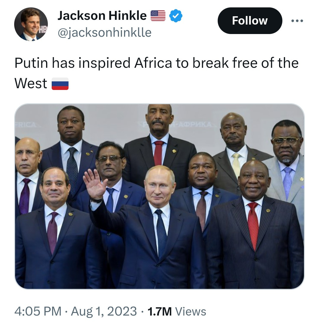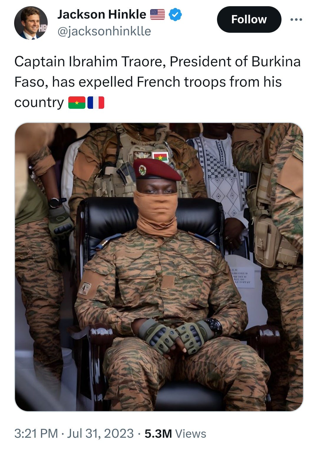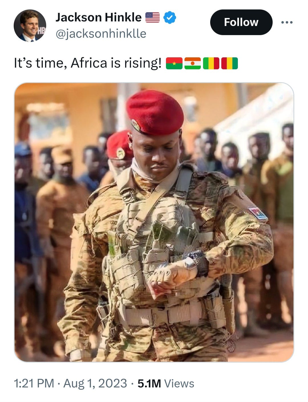 Last summer there was a coup d’etat in Niger, which was the latest coup to have affected the nations that are located in the Sahel region of Africa. Jackson Hinkle suddenly started posting about Niger, Burkina Faso, and the other affected countries in that region.