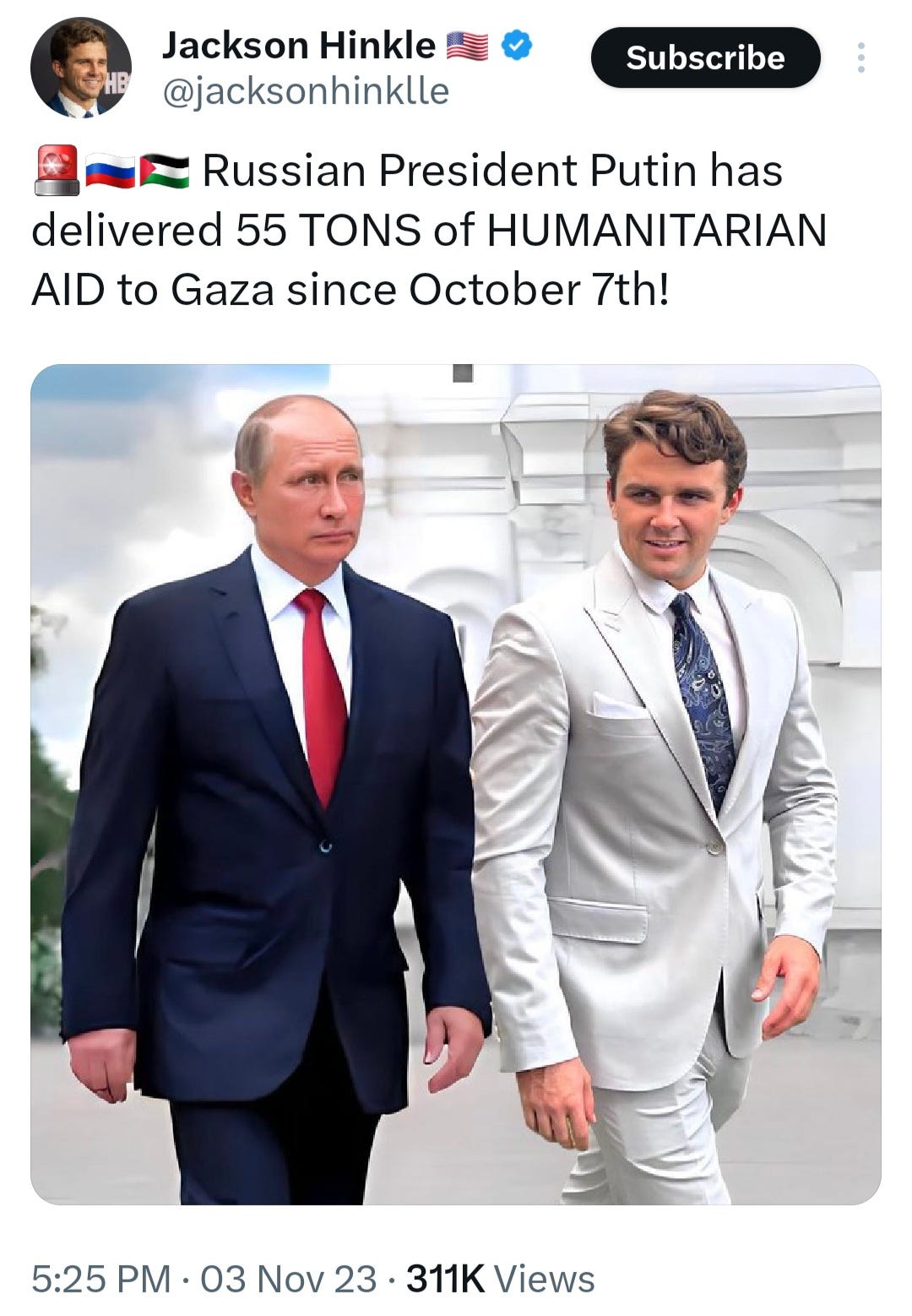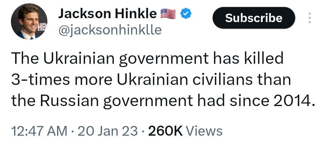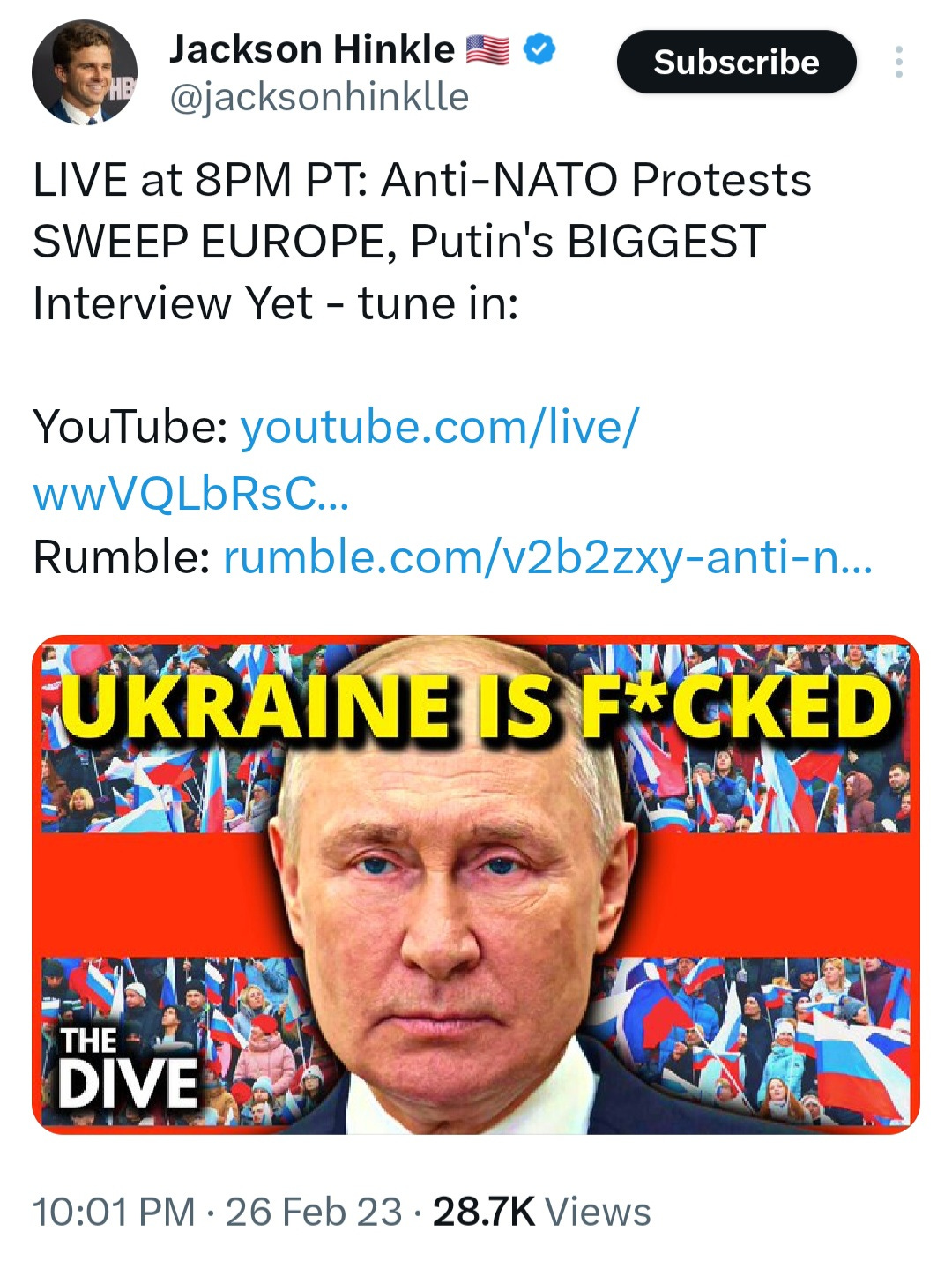 At least Lord Haw-Haw actually believed in the Nazi cause that he was promoting. God only knows how much of this stuff that Hinkle tweets he actually believes in. In normal peaceful times people like Jackson Hinkle would ultimately end up being laughed at and ignored. But now that there are two wars going on simultaneously and Elon Musk is amplifying him on Twitter/X, it’s much harder to simply write him off as some kind of a weirdo crank troll. We have to look at the possibility that he is working as a propagandist on behalf of Russia and the Kremlin is paying him to do so.
