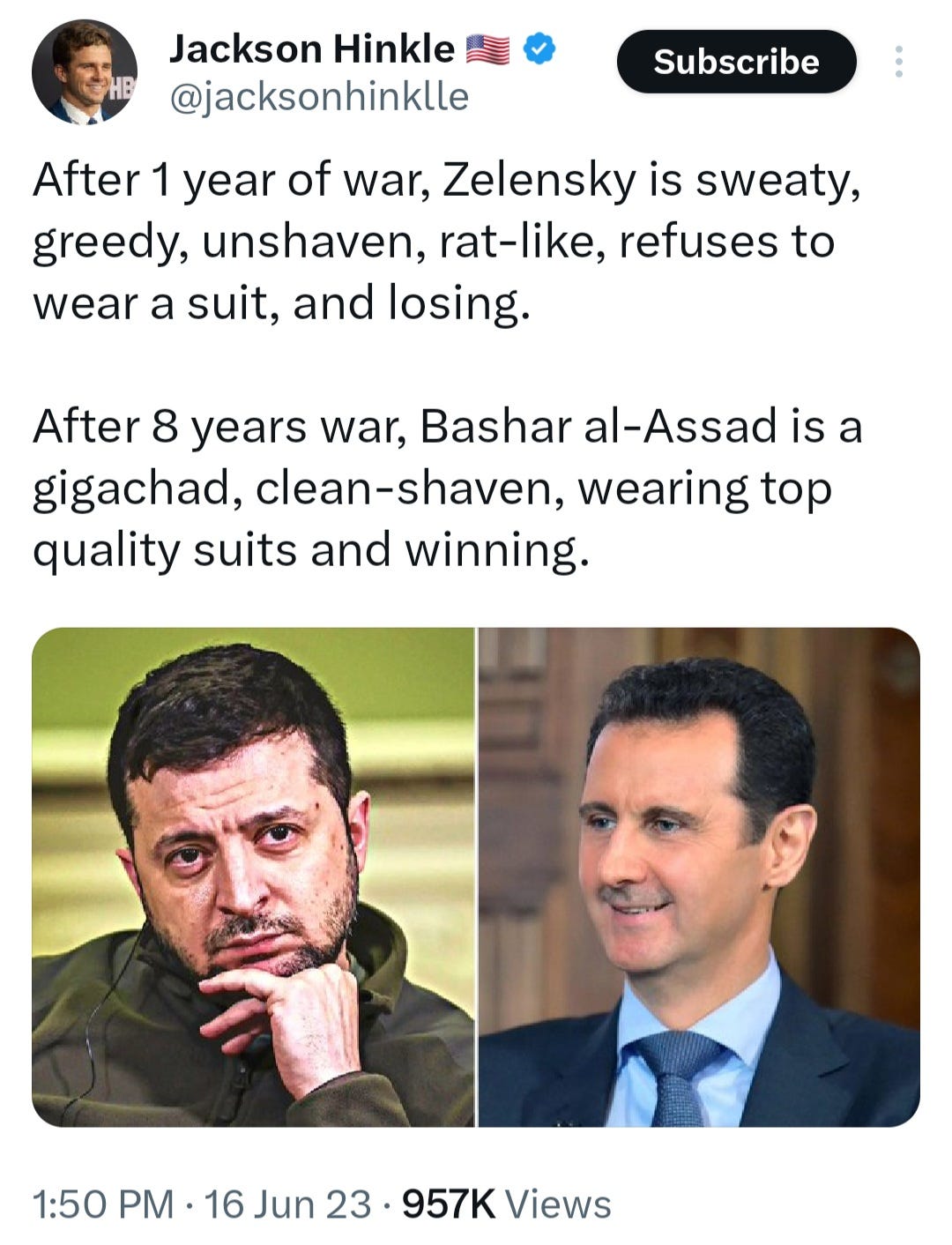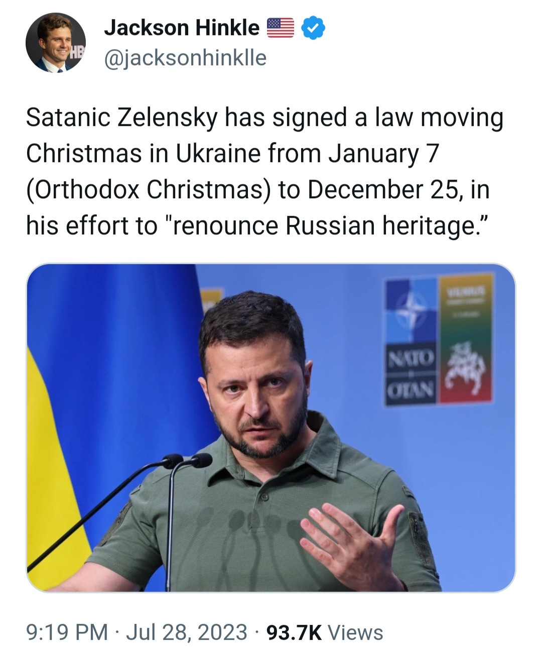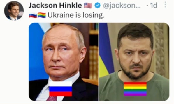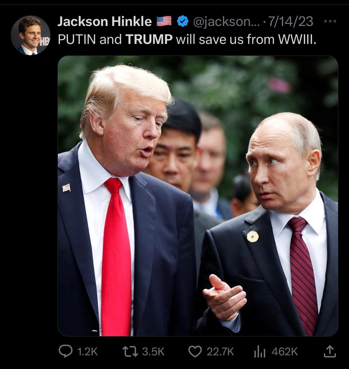 At least Lord Haw-Haw actually believed in the Nazi cause that he was promoting. God only knows how much of this stuff that Hinkle tweets he actually believes in. In normal peaceful times people like Jackson Hinkle would ultimately end up being laughed at and ignored. But now that there are two wars going on simultaneously and Elon Musk is amplifying him on Twitter/X, it’s much harder to simply write him off as some kind of a weirdo crank troll. We have to look at the possibility that he is working as a propagandist on behalf of Russia and the Kremlin is paying him to do so.