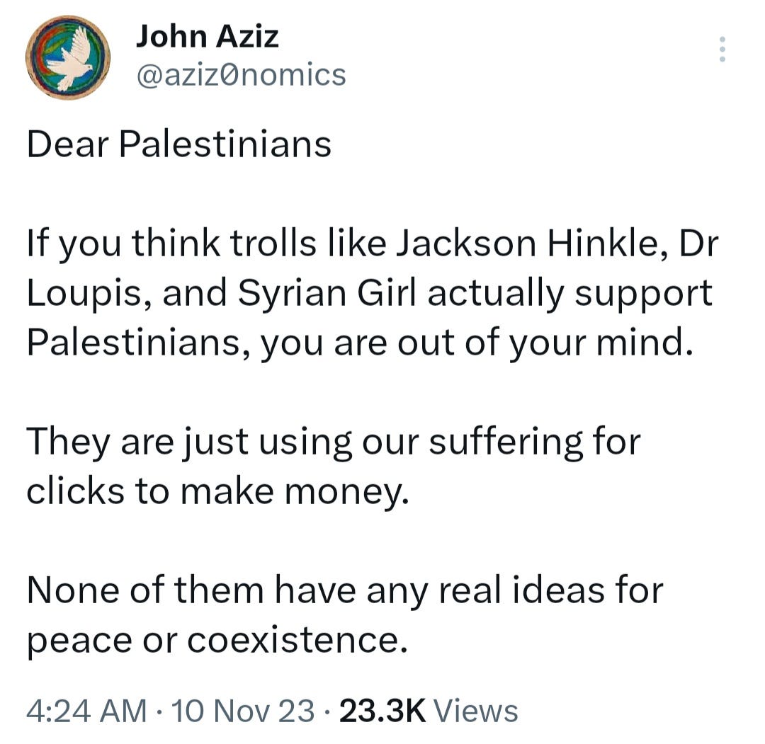 Jackson Hinkle’s pro-Hamas stance has put him at odds with other right wingers who are siding with Israel in this war. Even though Jackson Hinkle is claiming to be on the Palestinians’ side, some of them are realizing that Hinkle is only siding with them in an effort to make money.