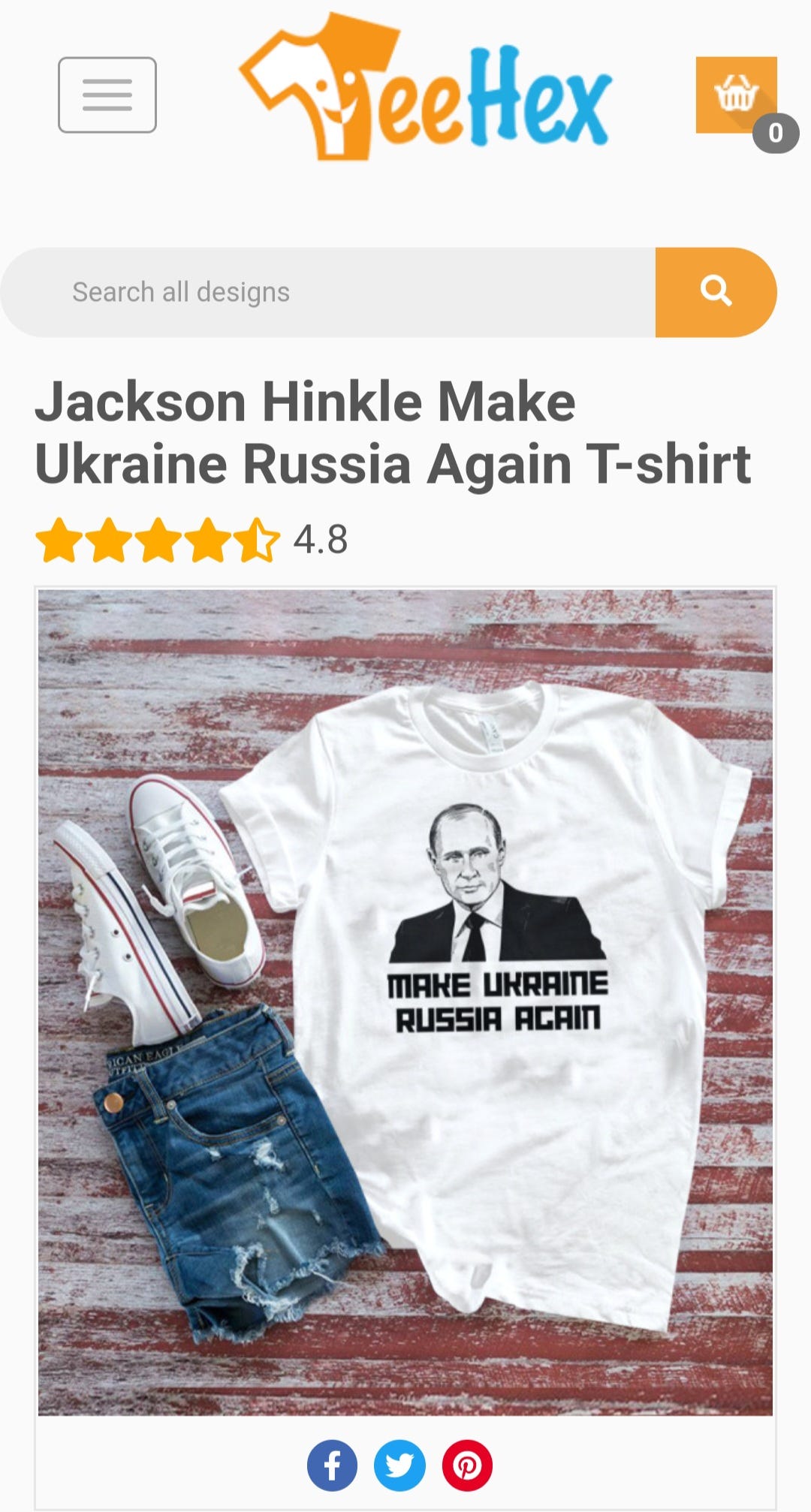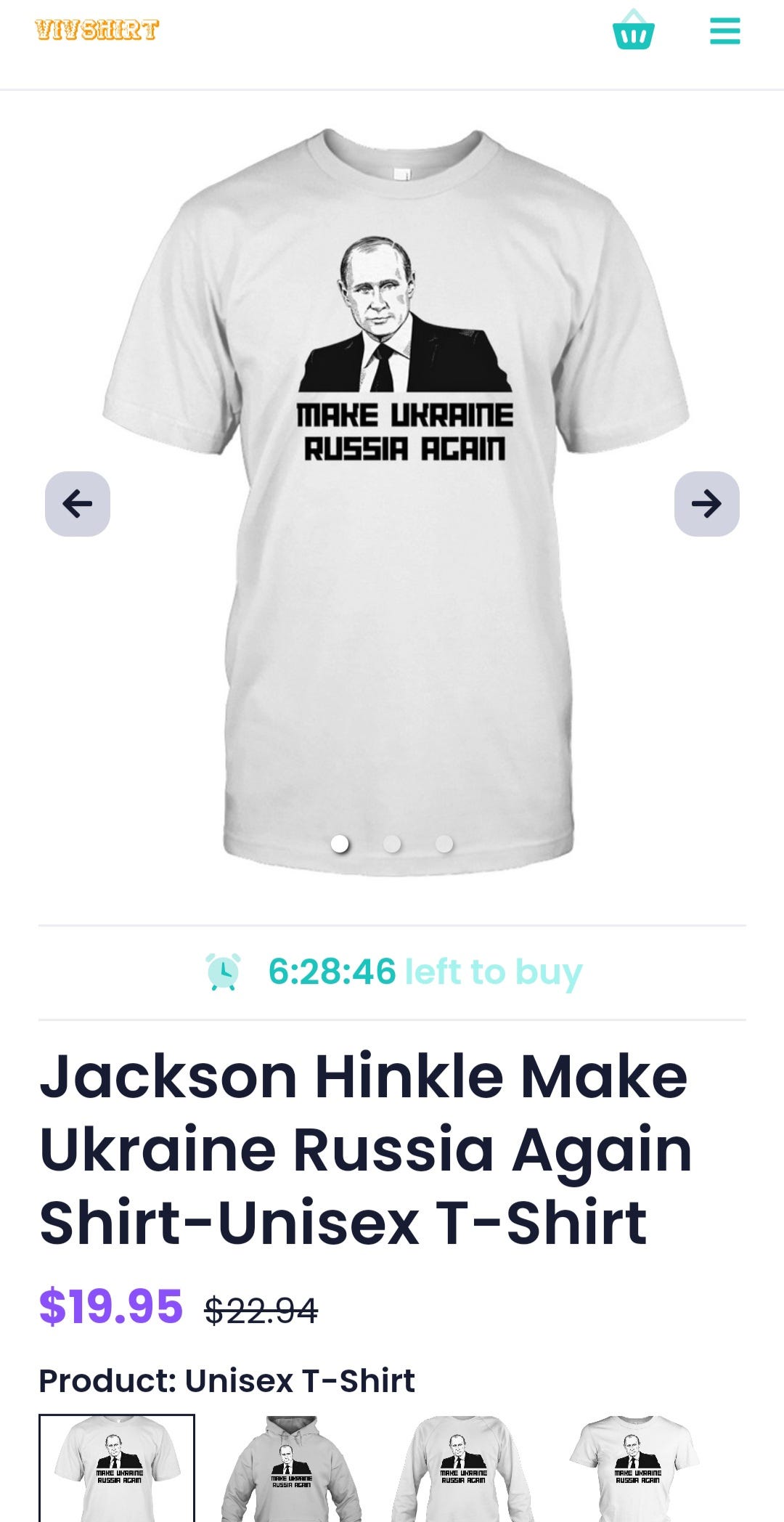 Those first efforts turned out to be short-lived because his online stores were closed soon after he opened them due to complaints from online pro-Ukraine activists. But it’s obvious that he hasn’t given up on selling t-shirts to monetize his pro-Russia stance. If you do a Google search on Jackson Hinkle Make Ukraine Russia Again, it’ll bring up a huge number of stores that are selling the same t-shirt featuring Vladimir Putin and the slogan “Make Ukraine Russia Again.” Here are screenshots of just two of the many online stores that are selling them.