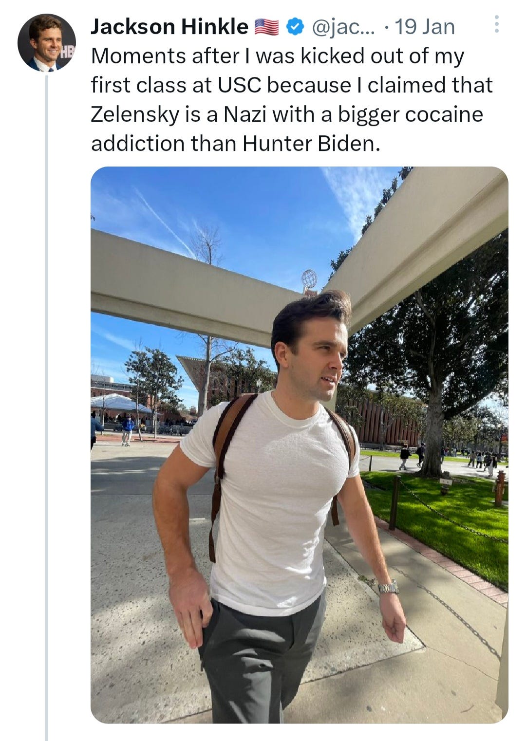 In January of this year Hinkle attempted to go back to college by attending the University of Southern California. That turned out to be a short-lived one-day effort when he claimed that he was thrown out of his first class for saying that Ukrainian President Volodymyr Zelenskyy is a Nazi with a bigger cocaine addiction than Hunter Biden, the son of the US President Joe Biden.