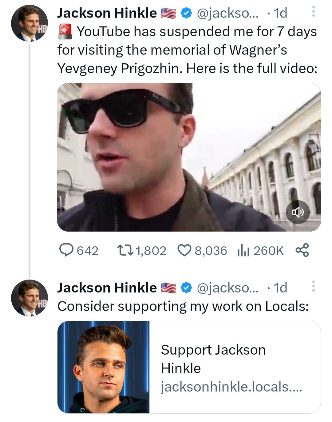 Despite his difficulties with being thrown off various online platforms and trying to make a living through promoting the Kremlin viewpoint in America, he is slowly being legitimized in the mainstream on a level that even Lord Haw-Haw never received. He was recently the subject of this inspirational LinkedIn post as someone to be admired in the business world for having the survival instinct to pivot from YouTube after being banned to Twitter/X. It's a “making lemons into lemonade” story that completely glosses over what could have led YouTube to ban him. To be blunt, Jackson Hinkle does not deserve any kind of mainstream legitimacy at all.