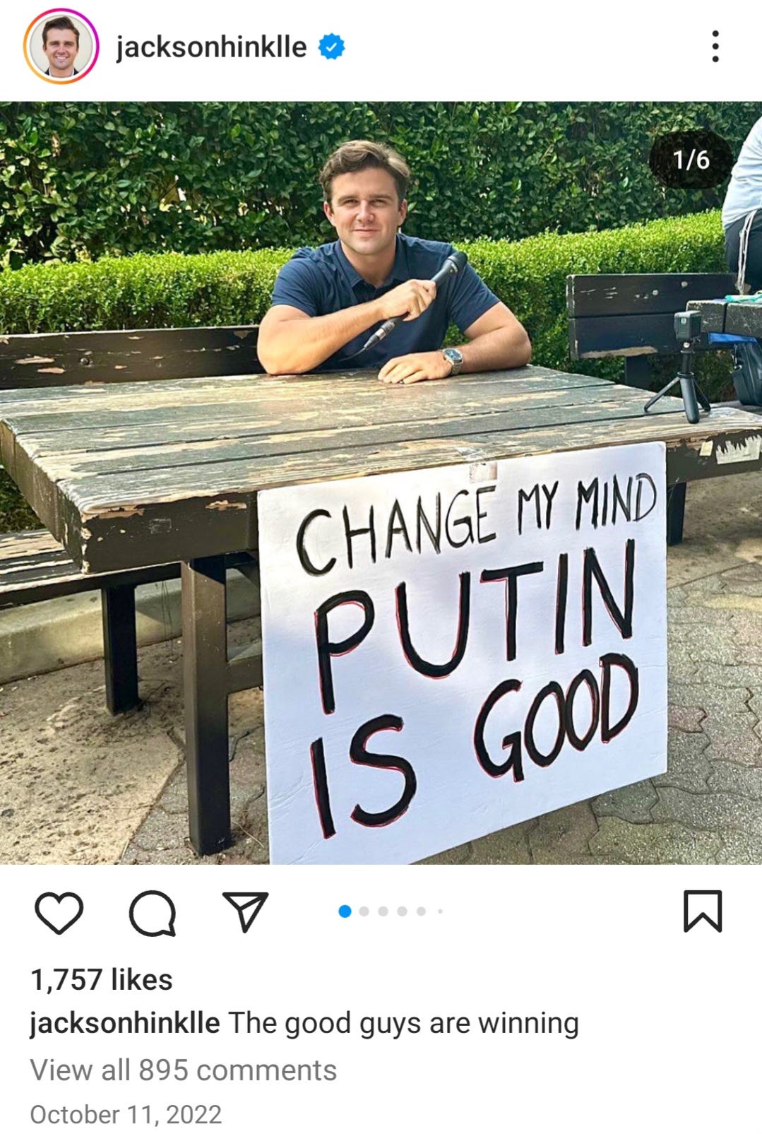 Along the way Jackson Hinkle has professed his admiration for former US President Donald Trump and Russian leader Vladimir Putin.