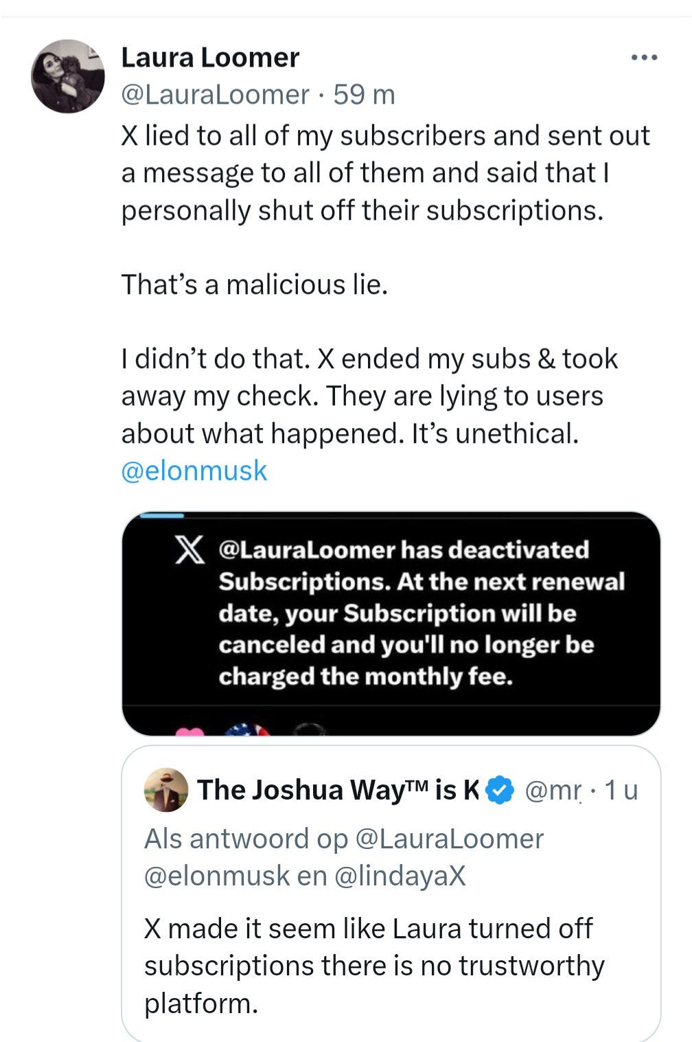 Loomer was a paid subscriber to Twitter/X, which enabled her to share in whatever profits that platform generates. But when she questioned Musk's stance on H-1Bs and Musk’s relationship with China, he retaliated by removing her blue check (which labeled her as a subscriber) and placing her entire account under review. She also made this tweet where she said that X had sent out a message to her subscribers claiming that she had personally deactivated their subscriptions and her subscribers will no longer be charged the monthly fee at the next renewal date. She said that that message was a total lie and she claimed that X was the one who disabled the subscriptions, which means that Loomer will no longer get paid for getting users to like and share her tweets.