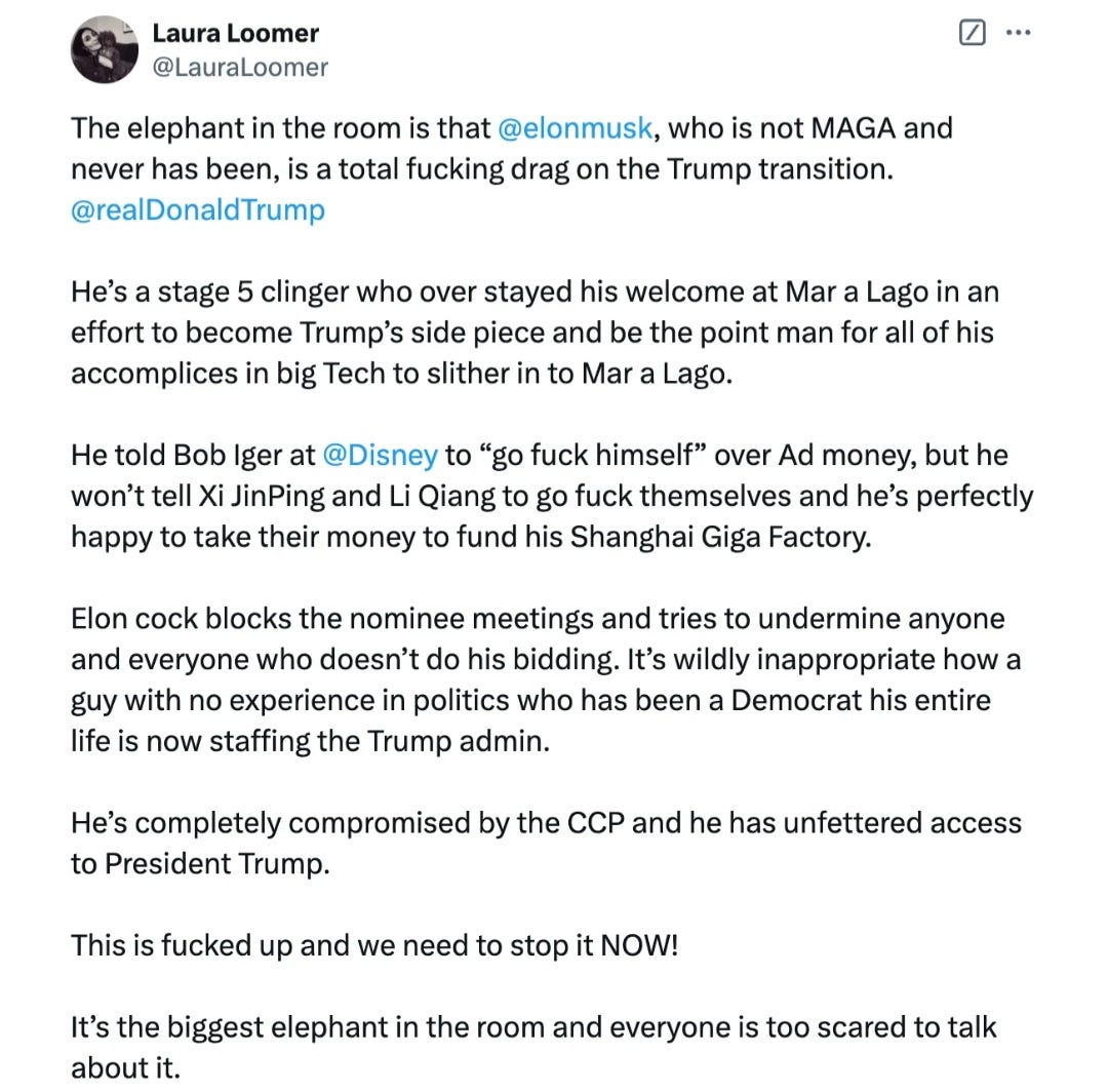 But Steve Bannon isn't the only right-winger whom Elon Musk has alienated. There's Laura Loomer as well.