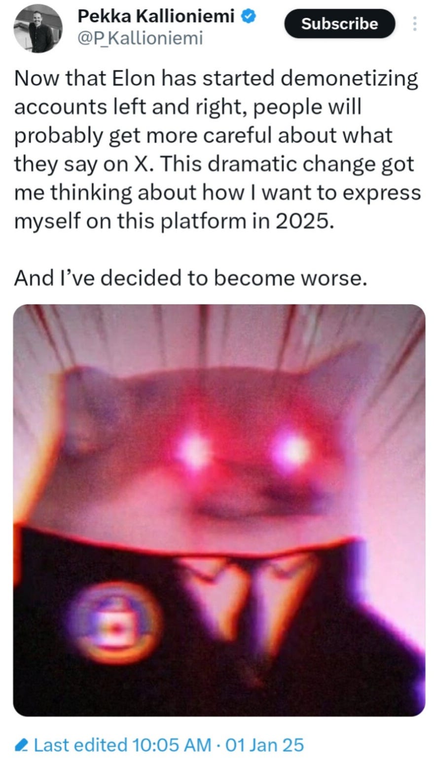 Now that Elon has started demonetizing accounts left and right, people will probably get more careful about what they say on X. This dramatic change got me thinking about how I want to express myself on this platform in 2025.