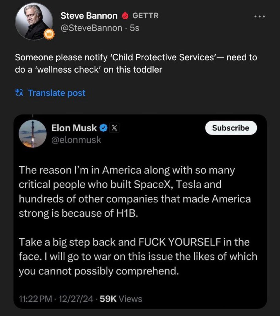 With all those crazy tweets that Musk made against his own side throughout the Christmas holidays, it makes one wonder if Ketamine is somehow messing with Musk's sanity. Steve Bannon made this post on Gettr where he posted a screenshot of Musk's now-infamous “FUCK YOURSELF in the face” tweet and he added this comment: “Someone please notify ‘Child Protective Services’—need to do a ‘wellness check’ on this toddler.”