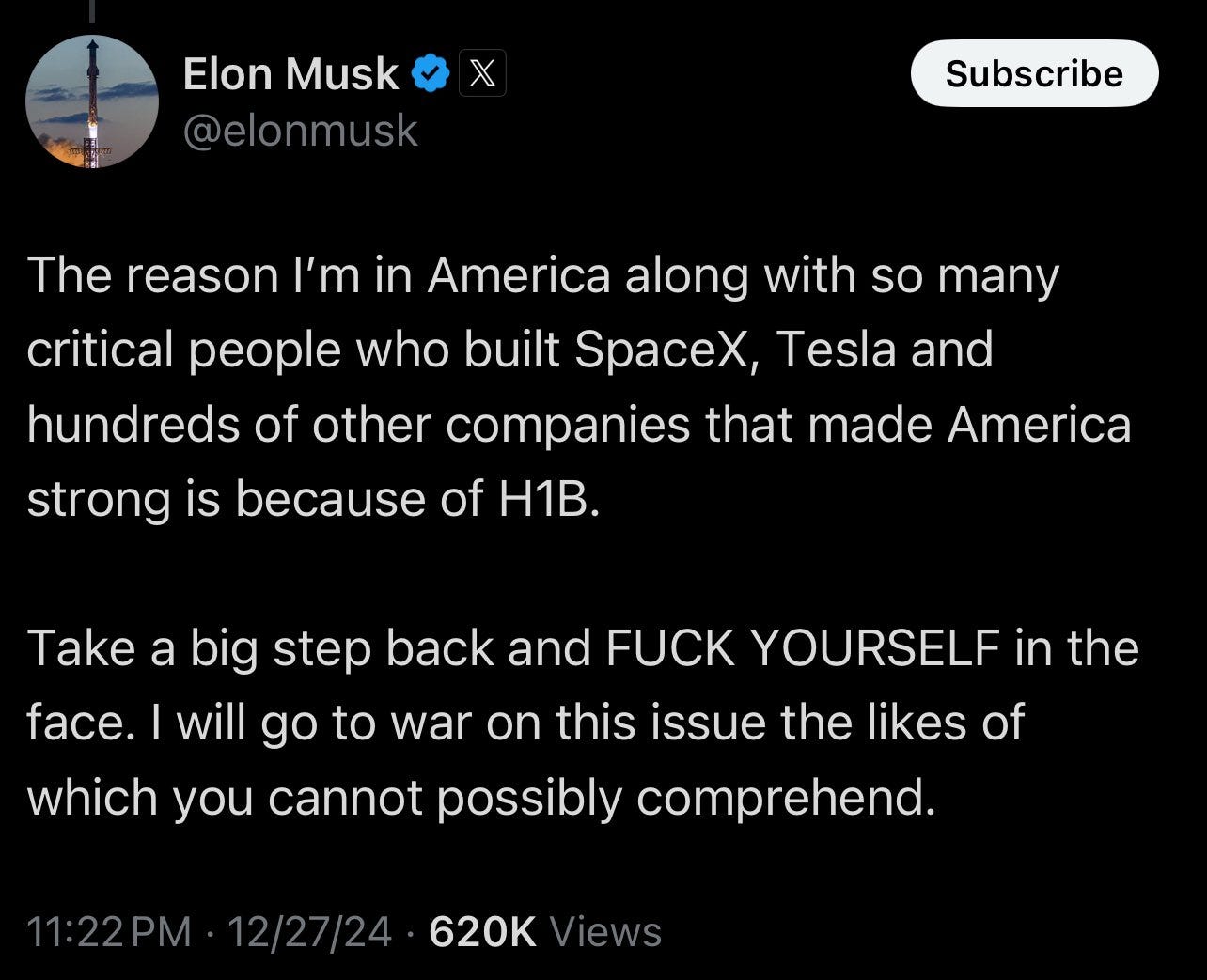 When Krishnan spoke out about his approval of H-1Bs, this naturally alienated the poor and working class white Americans along with their allies. Then Elon Musk began to speak up about how he also approves of H-1Bs, which alienated the other faction even further. He tweeted: