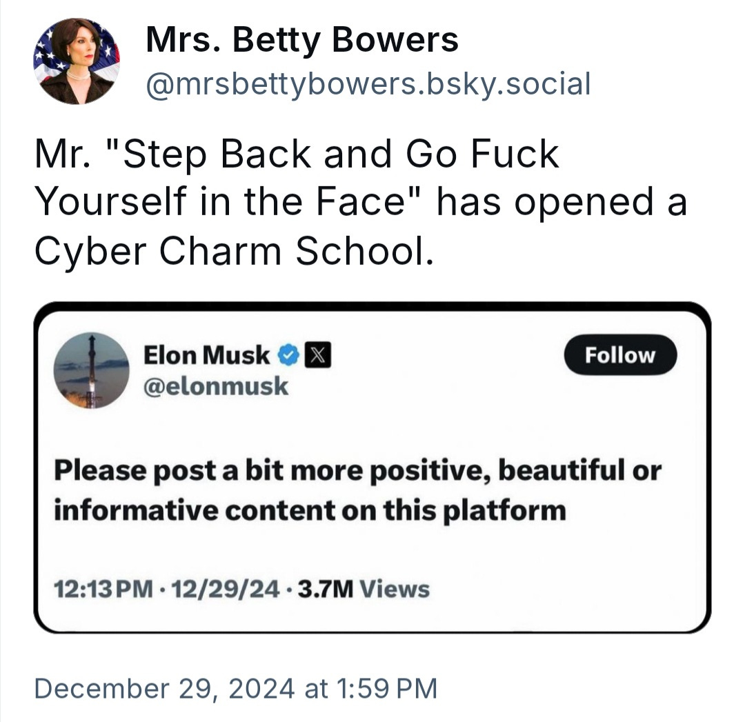 After Elon Musk created drama by being in favor of H-1Bs, telling others to go fuck themselves in the face, calling for comtempible fools to be removed root and stem from the Republican Party, and deactivating the paid subscriptions of MAGA accounts who have come out against H-1Bs, Musk hypocritically puts out a tweet asking “Please post a bit more positive, beautiful or informative content on this platform.” This prompted Mrs. Betty Bowers to retweet Musk's message while adding “Mr. ‘Step Back and Go Fuck Yourself in the Face’ has opened a Cyber Charm School.”