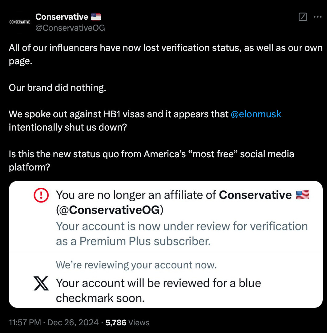 Another account, ConservativeOG, also lost its verification status when it cane out against H-1Bs on Twitter/X.