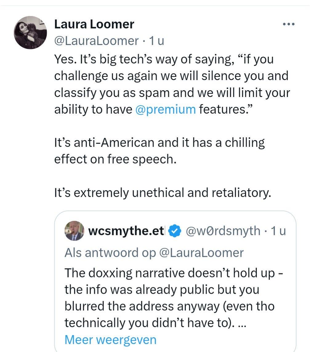 This incident is making me feel sorry for Laura Loomer—and I can't even stand her. She is pro-Kremlin, anti-Ukraine, and an all-around conspiracy theorist but she is absolutely correct in calling out Elon Musk for claiming to be a champion of free speech—only if it's speech that he personally agrees with.