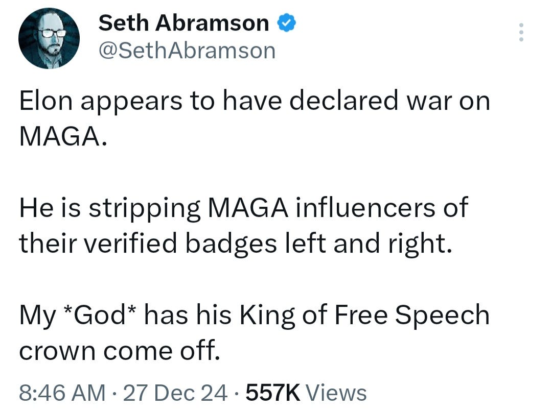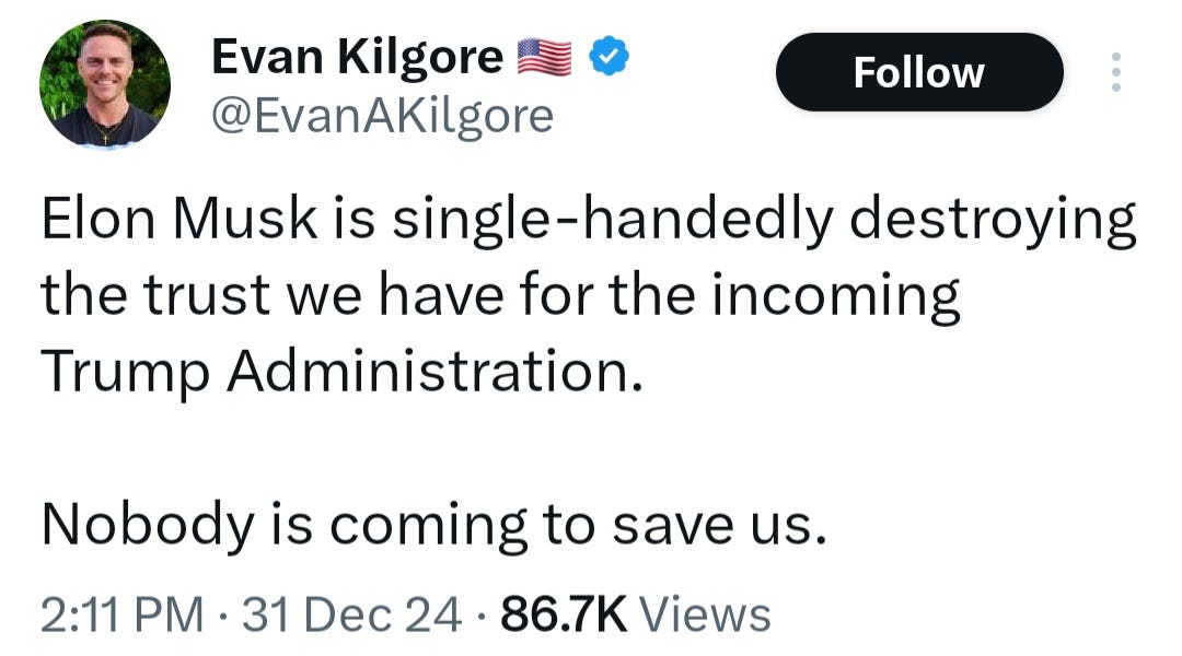 This has led to other MAGA accounts attacking Musk for having an adverse effect on the second Trump Administration before it even takes office in Washington, DC. As Evan Kilgore tweeted: