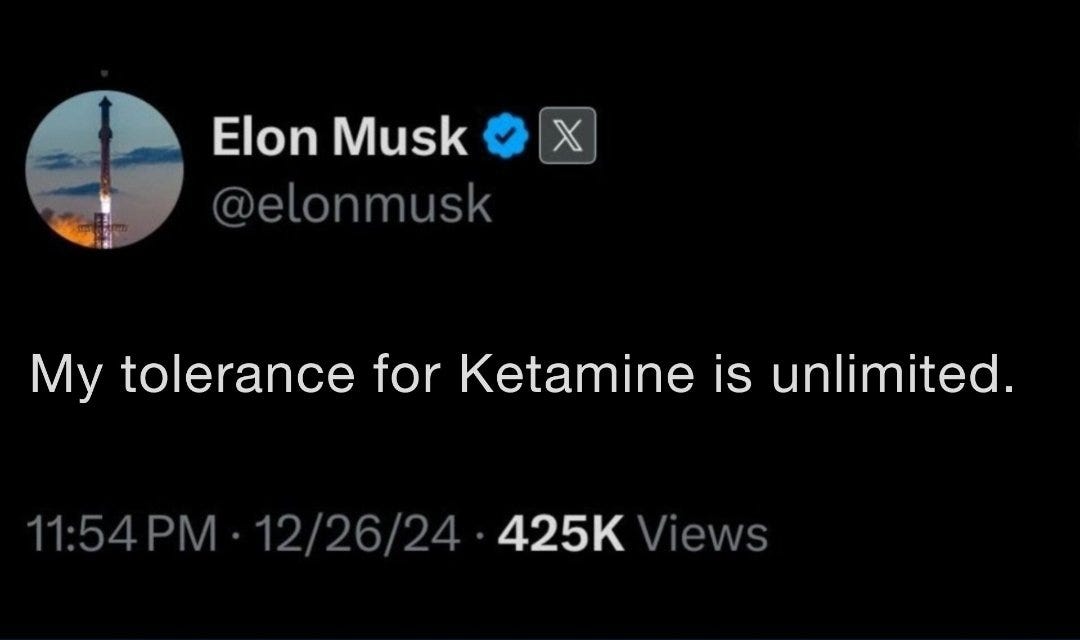 Elon Musk, who is also a frequent user of the drug Ketamine, made this tweet where he said “My tolerance for Ketamine is unlimited.”