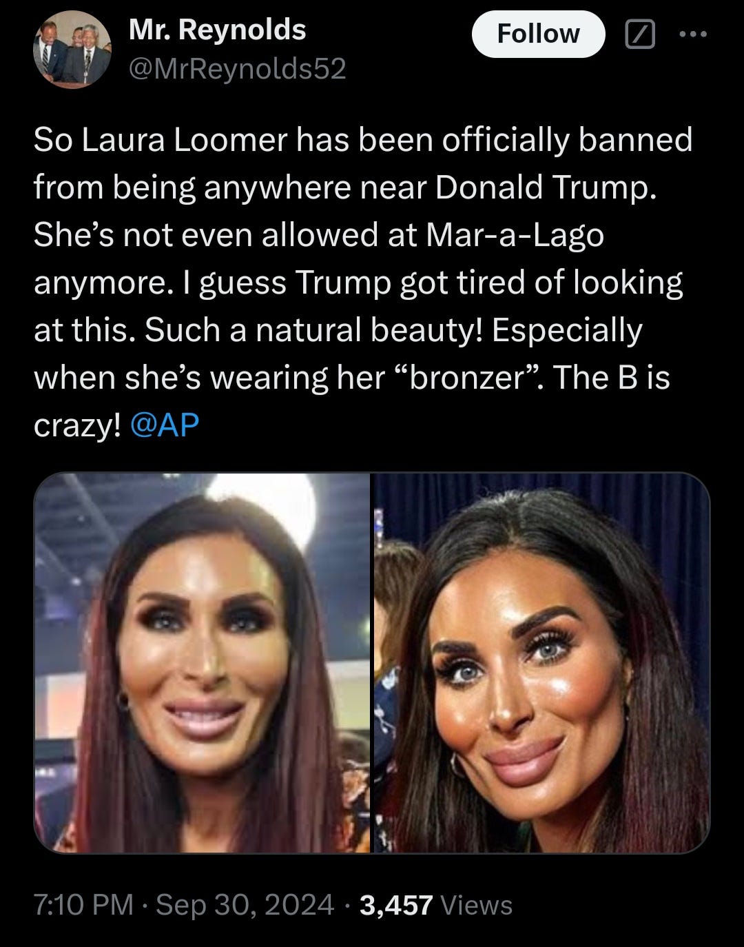 When we last left off, back in September so-called “journalist” Laura Loomer flew with Donald Trump on his personal plane to attend Trump's only debate with Kamala Harris. Afterwards she hung around Trump for a while, which fueled rumors of an affair between the two, which, in turn, led to Loomer suing Bill Maher and HBO after Maher made a joke about the alleged affair on his HBO show Real Time With Bill Maher. It also led to a catfight with Marjorie Taylor Greene and made Trump's advisors worried about Trump’s association with Loomer. Apparently those advisors got their way when there were rumors that Loomer was officially banned from going anywhere near Donald Trump and she would no longer be welcomed at Mar-a-Lago.