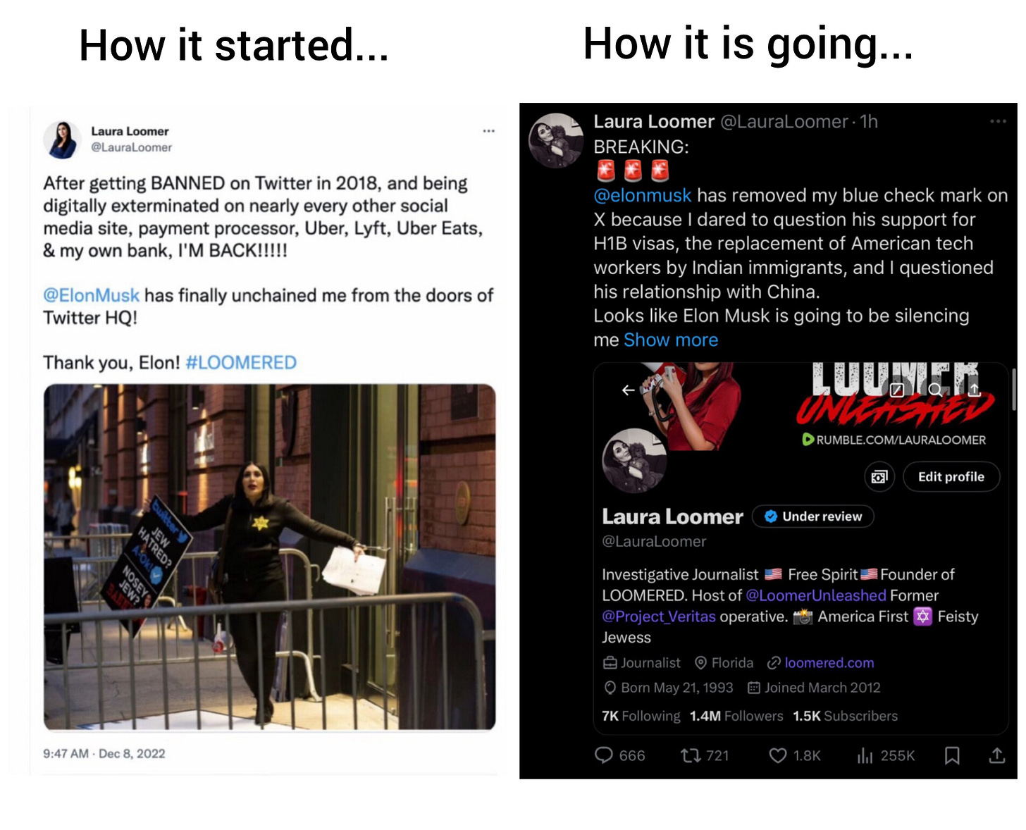 Laura Loomer has been notorious for the last few years. Before her time with Trump Laura Loomer was banned from Twitter in 2018 for making an anti-Muslim tweet aimed at Representative Ilhan Omar. This led to Loomer traveling to Twitter's New York City offices where she handcuffed herself to the front door as a form of nonviolent protest demanding that she gets reinstated. Twitter stood its ground and she remained banned until after Elon Musk purchased the social media platform in late 2022 and decided to reinstate her. Initially Loomer felt grateful towards Musk for reinstating her but, as a comparison between these two tweets show, things are no longer warm and fuzzy between the two.