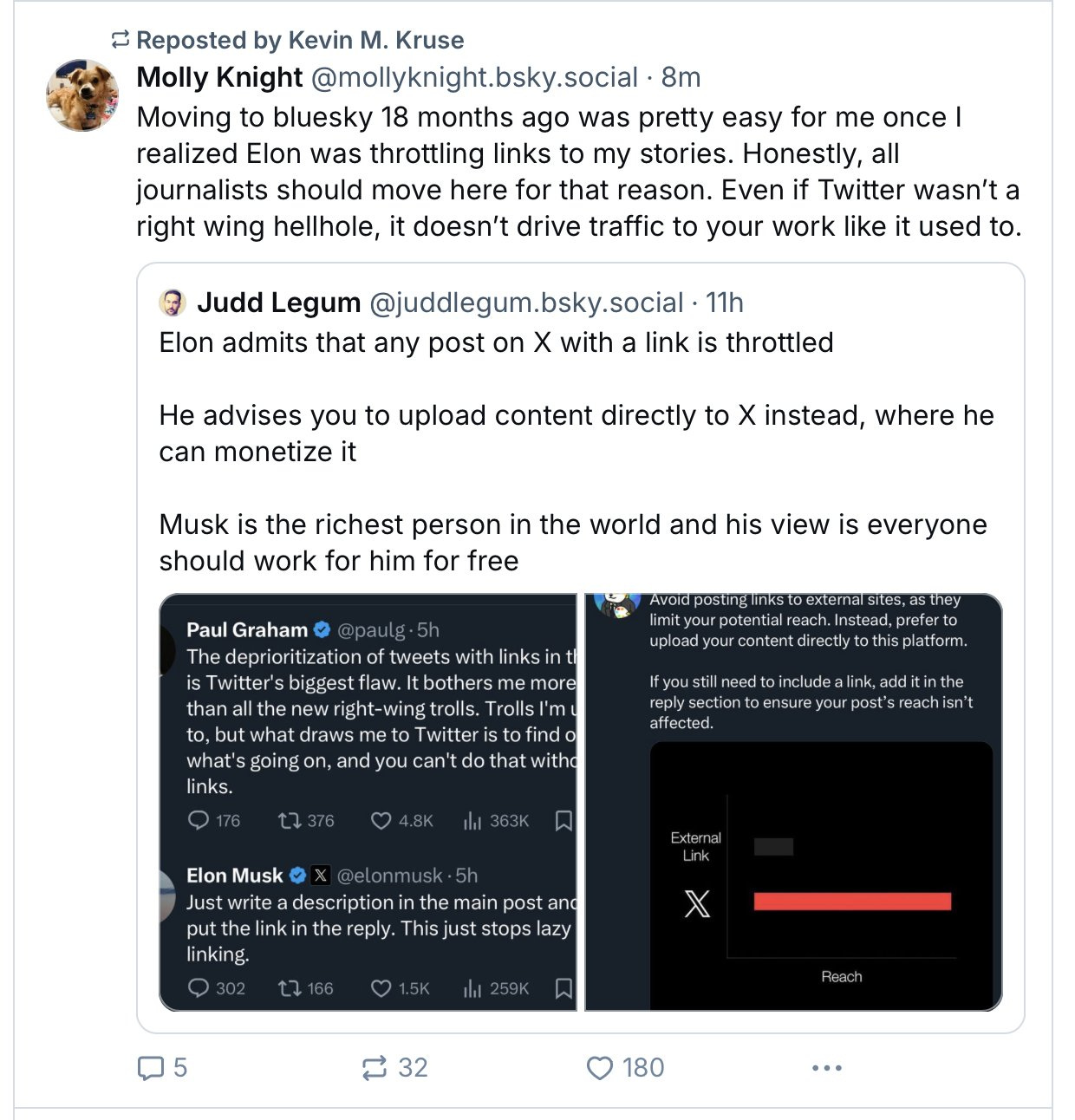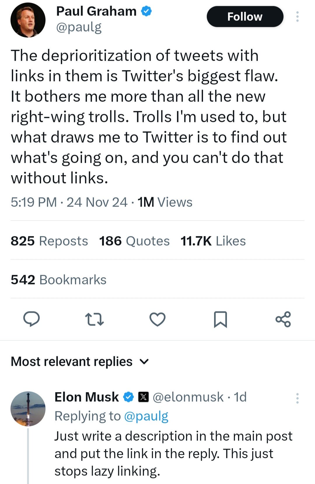 On top of it, Twitter/X under Elon Musk is hostile to linking to external sites. Linking to other sites have long been a hallmark of online activity since the rise of the World Wide Web in the 1990s. But now it's different. Paul Graham tweeted “The deprioritization of tweets with links in them is Twitter's biggest flaw. It bothers me more than all the new right-wing trolls. Trolls I'm used to, but what draws me to Twitter is to find out what's going on, and you can't do that without links.” Elon Musk responded to that tweet with “Just write a description in the main post and put the link in the reply. This just stops lazy linking.”
