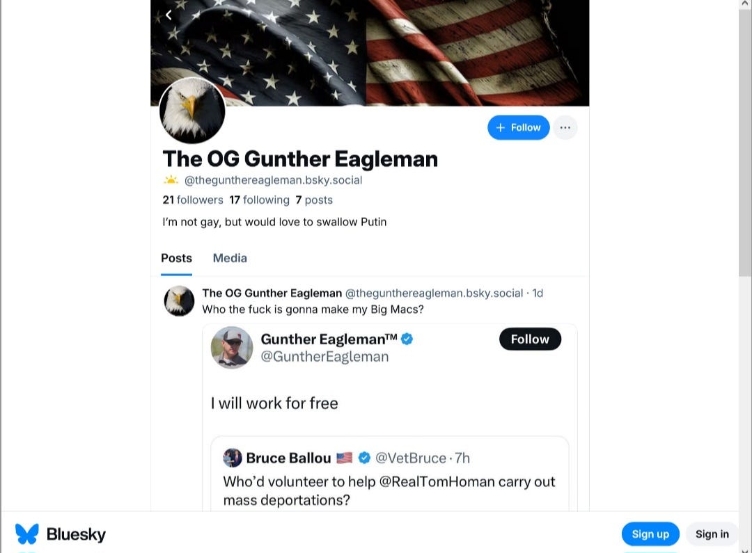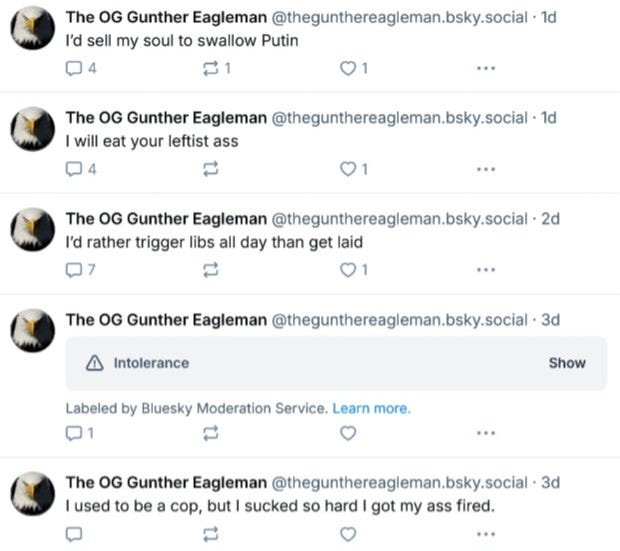 The people on Bluesky also take a dim view on Elon Musk's favorite Twitter/X accounts migrating over to Bluesky in the hopes of starting online fights. One of them, a pro-Putin, pro-Trump, pro-MAGA guy known as Gunther Eagleman attempted to do just that on Bluesky.