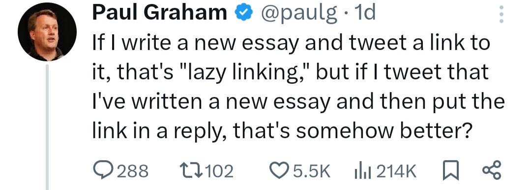 Graham responded with “If I write a new essay and tweet a link to it, that's ‘lazy linking,’ but if I tweet that I've written a new essay and then put the link in a reply, that's somehow better?”