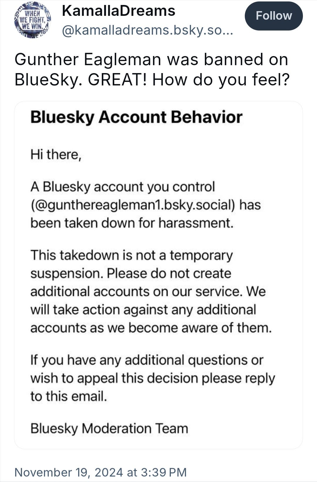 Gunther Eagleman's time on Bluesky didn't end well for him—his account was reported so much that he was completely banned from the platform for harassment.