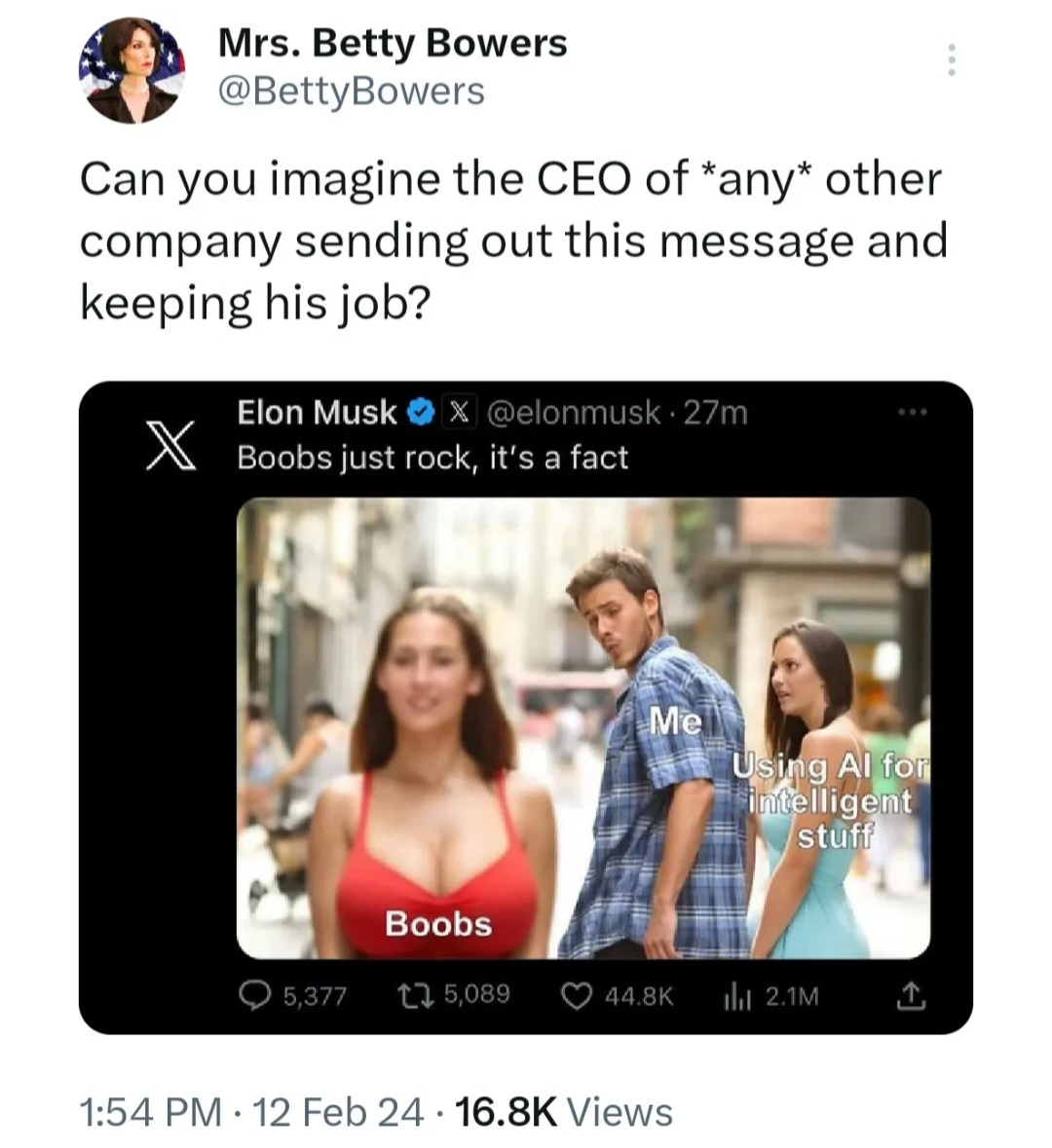 There's also the frequent juvenile stuff that Elon Musk posts that shows how immature he really is.