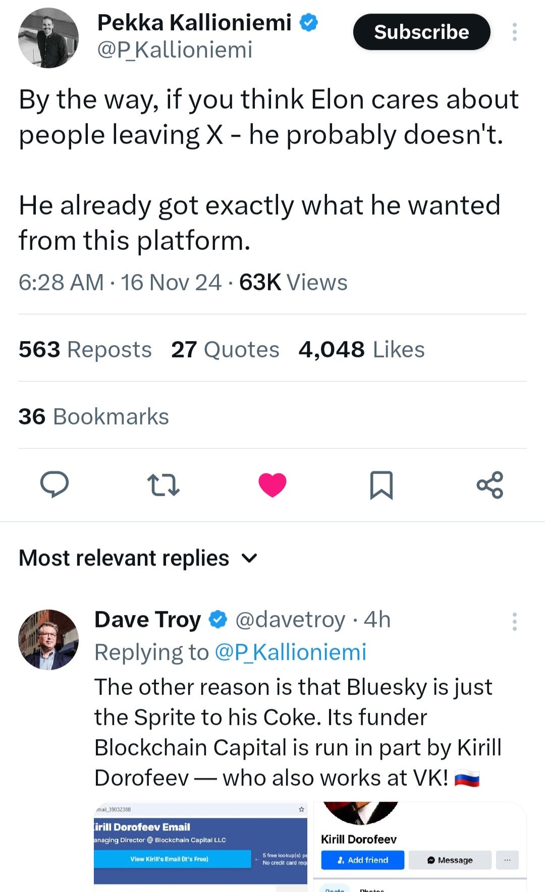 That's pretty interesting to learn that Bluesky has a Russian investor but, so far, that fact hasn't deterred people from continuing to ditch Twitter/X for Bluesky. As to whatever the ultimate outcome will be for Twitter/X, Elon Musk will still continue to be a multi-billionaire no matter what happens to his social media platform so one shouldn't ever feel sorry for him.