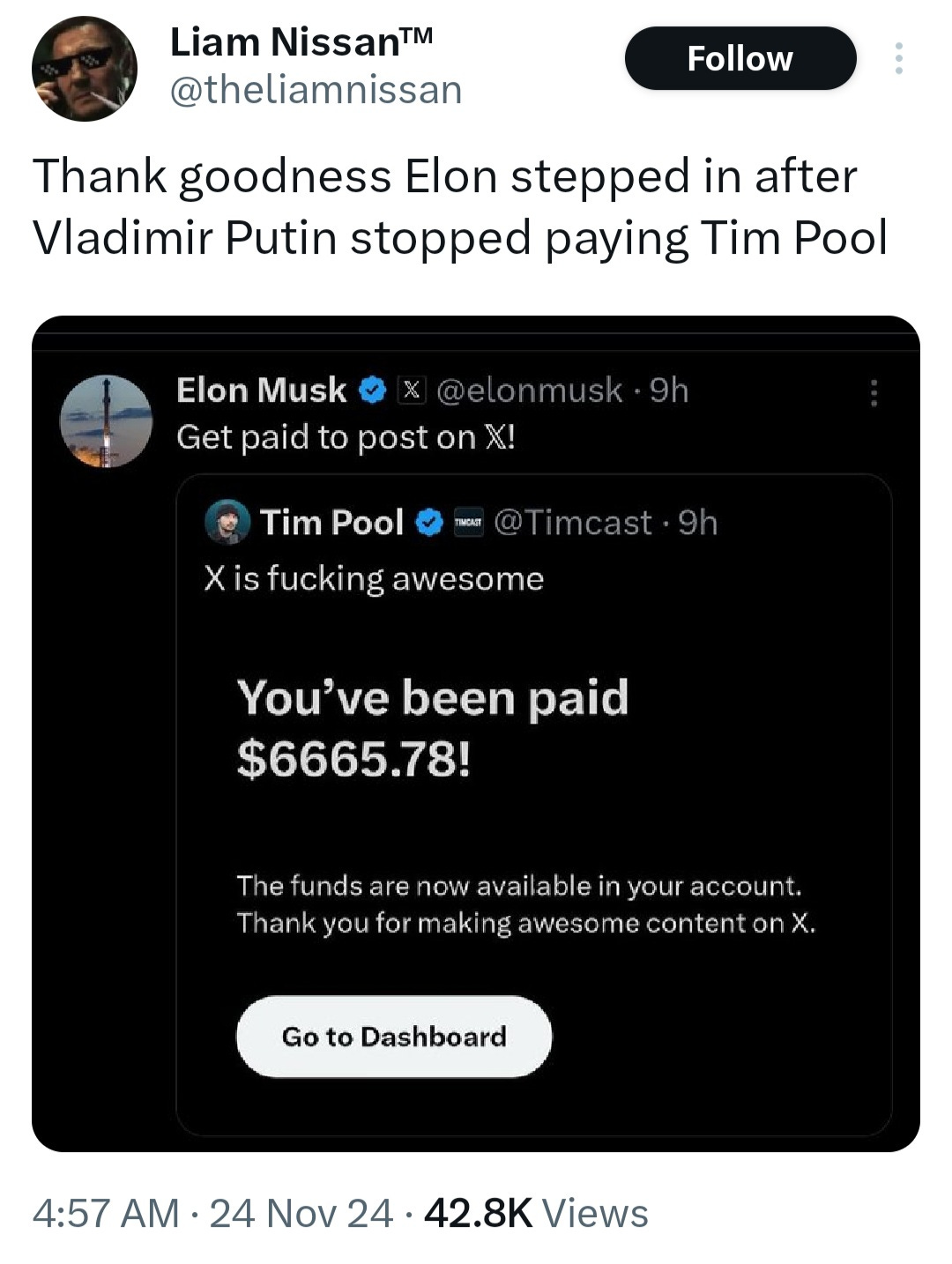 There was initially a mass-exodus when Elon Musk first purchased the site in October, 2022. The exodus away from Twitter continued when Musk began to reconfigure the algorithm so users began to see far-right wing content from people like Jackson Hinkle and Tim Pool regardless of whether one followed those people or not. And some of these people not only pay for a subscription but they also get paid for their posts. Recently Tim Pool made a tweet that included a screenshot announcing that he was just paid $6665.78 while writing “X is fucking awesome!” Elon Musk retweeted Pool's tweet while adding “Get paid to post on X!” Liam Nissan retweeted that tweet while adding “Thank goodness Elon stepped in after Vladimir Putin stopped paying Tim Pool.” (That's in reference to Tim Pool's involvement with the Kremlin-funded TENET Media.)
