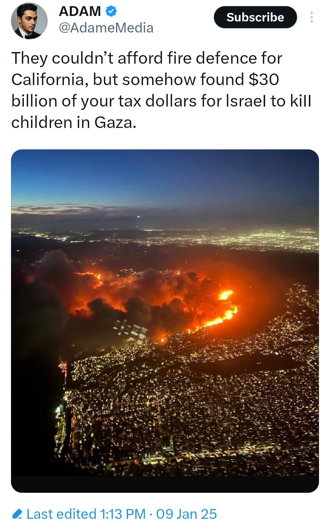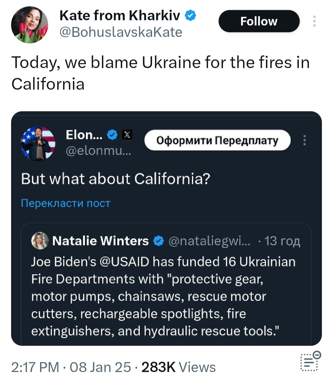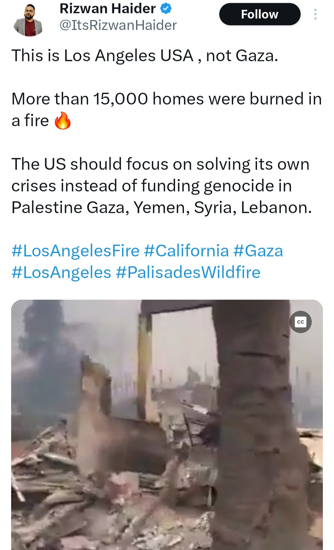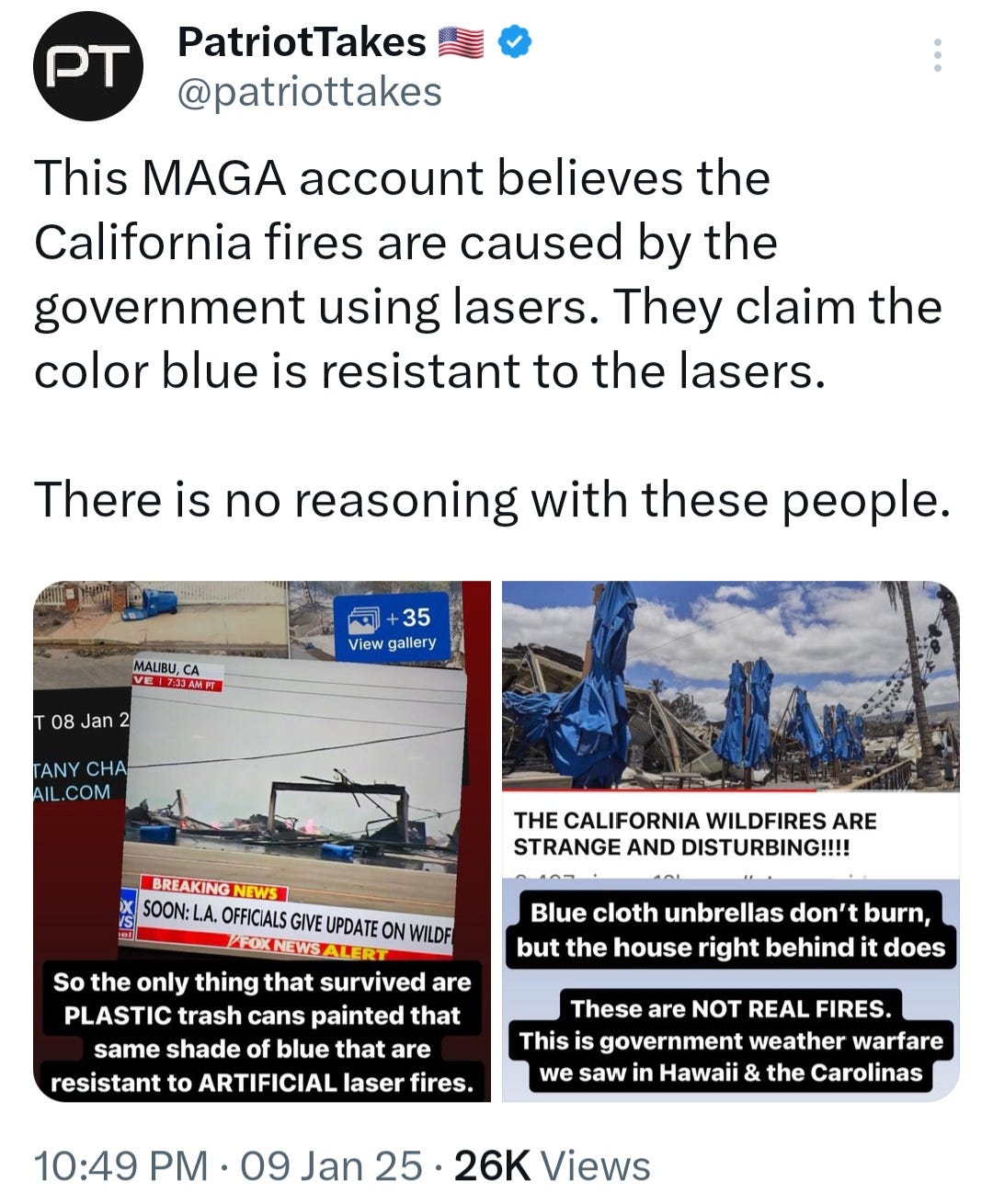 What the people are going through in California in terms of losing their homes, their possessions, and even their lives is bad enough but there are other things they have to deal with—Kremlin propaganda. Just like the earlier collapse of the Francis Scott Key Bridge in Baltimore and Hurricane Helene's rampage through the South, Kremlin propagandists and their Republican allies are taking advantage of the situation to spread disinformation primarily on Twitter/X. Here are just a few disgusting samples, which includes the government using lasers to start the wildfires and the wildfires aren't being contained because the US had previously sent so much aid and equipment to other countries (namely Israel, Ukraine, Gaza, Yemen, Syria, and Lebanon) that California doesn't have enough equipment to fight those fires.