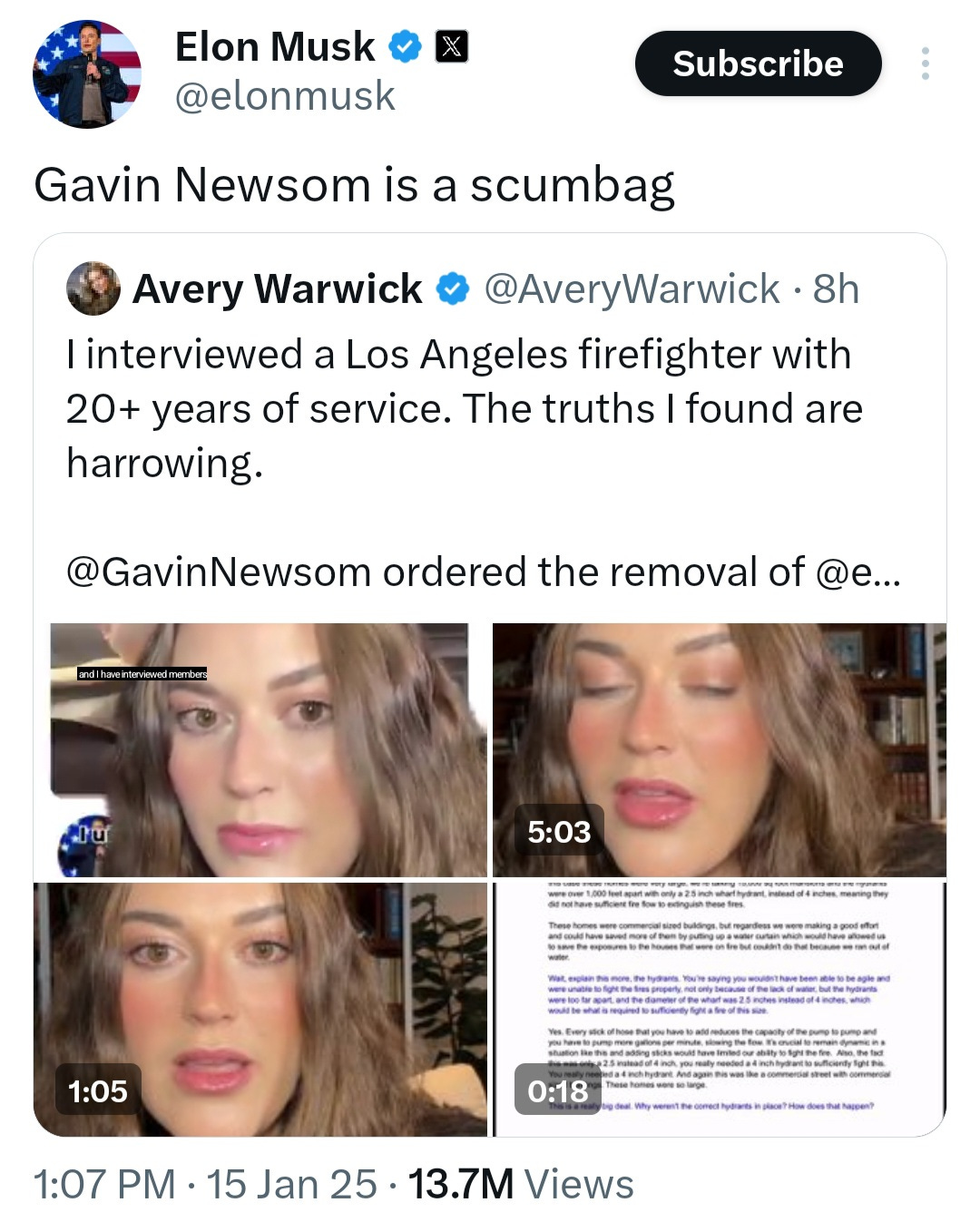The previous attempts to politicize disasters were a way of discrediting President Joe Biden. Since Biden will be out of the White House in a few days and he's being replaced by Putin's favorite president, Donald Trump, these propagandists have a new target: California Governor Gavin Newsom. Why him? Because he's a Democrat who's a rising star in the Democrat Party. Some people have even speculated that he could become president one day. So he has become a new target for both the Kremlin and the GOP. Elon Musk, the owner of a bunch of companies and Vladimir Putin sympathizer, took to his own Twitter/X platform to retweet an anti-Newsom tweet while adding “Gavin Newsom is a scumbag.”
