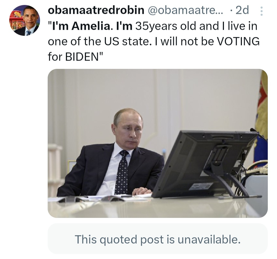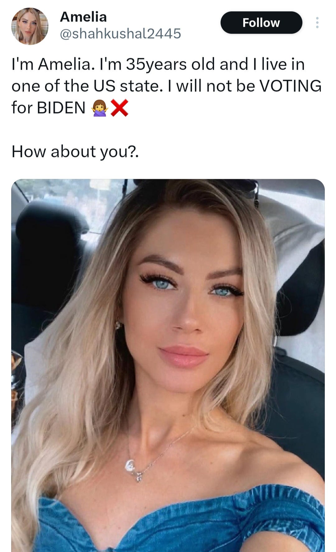 With the US election in November, Russia is ramping up its propaganda efforts to make sure that Donald Trump wins. Someone posted this on Twitter/X where this message said “I'm Amelia. I'm 35 years old and I live in one of the US state. I will not be VOTING for BIDEN. How about you?”